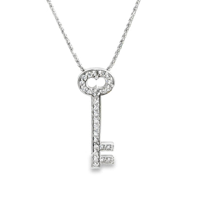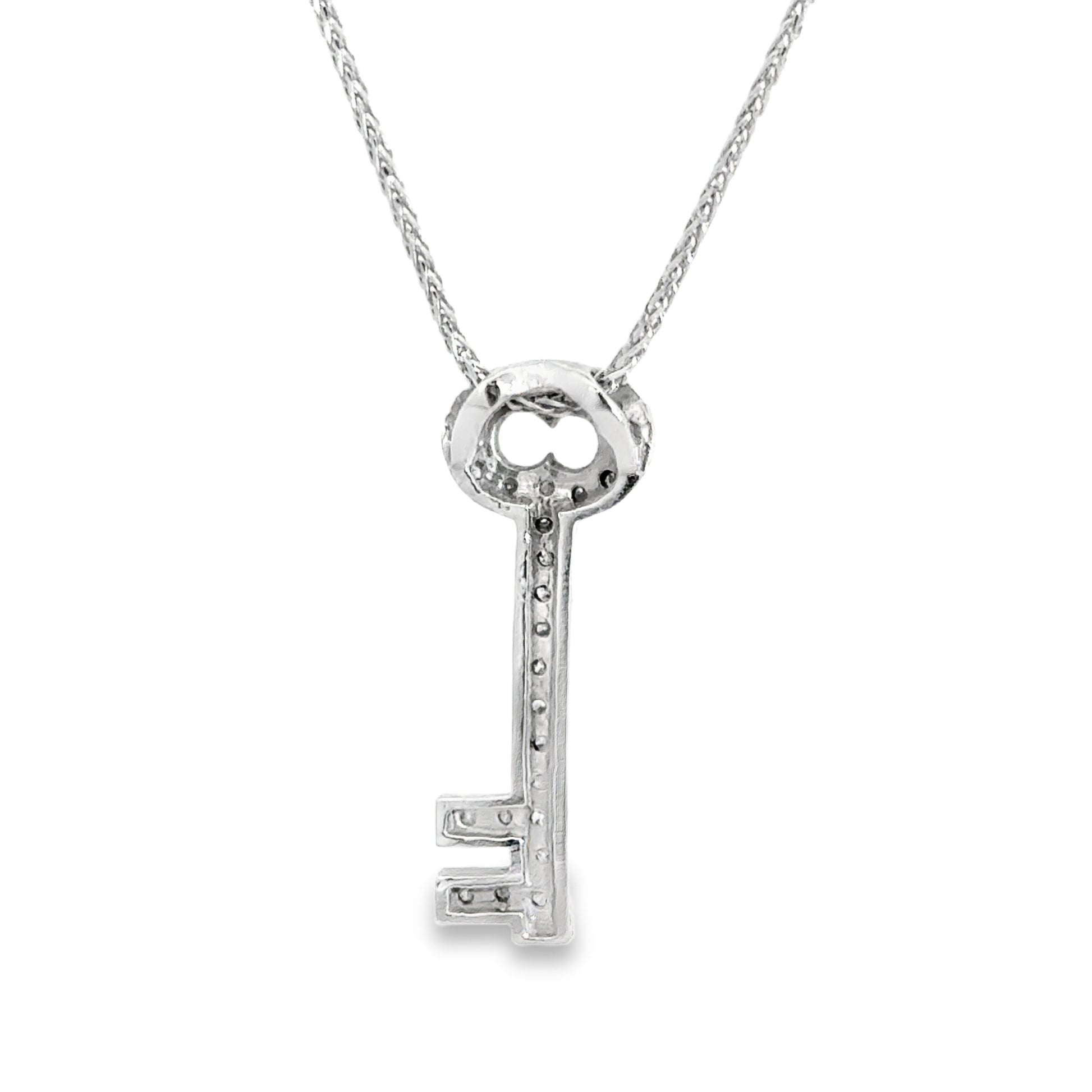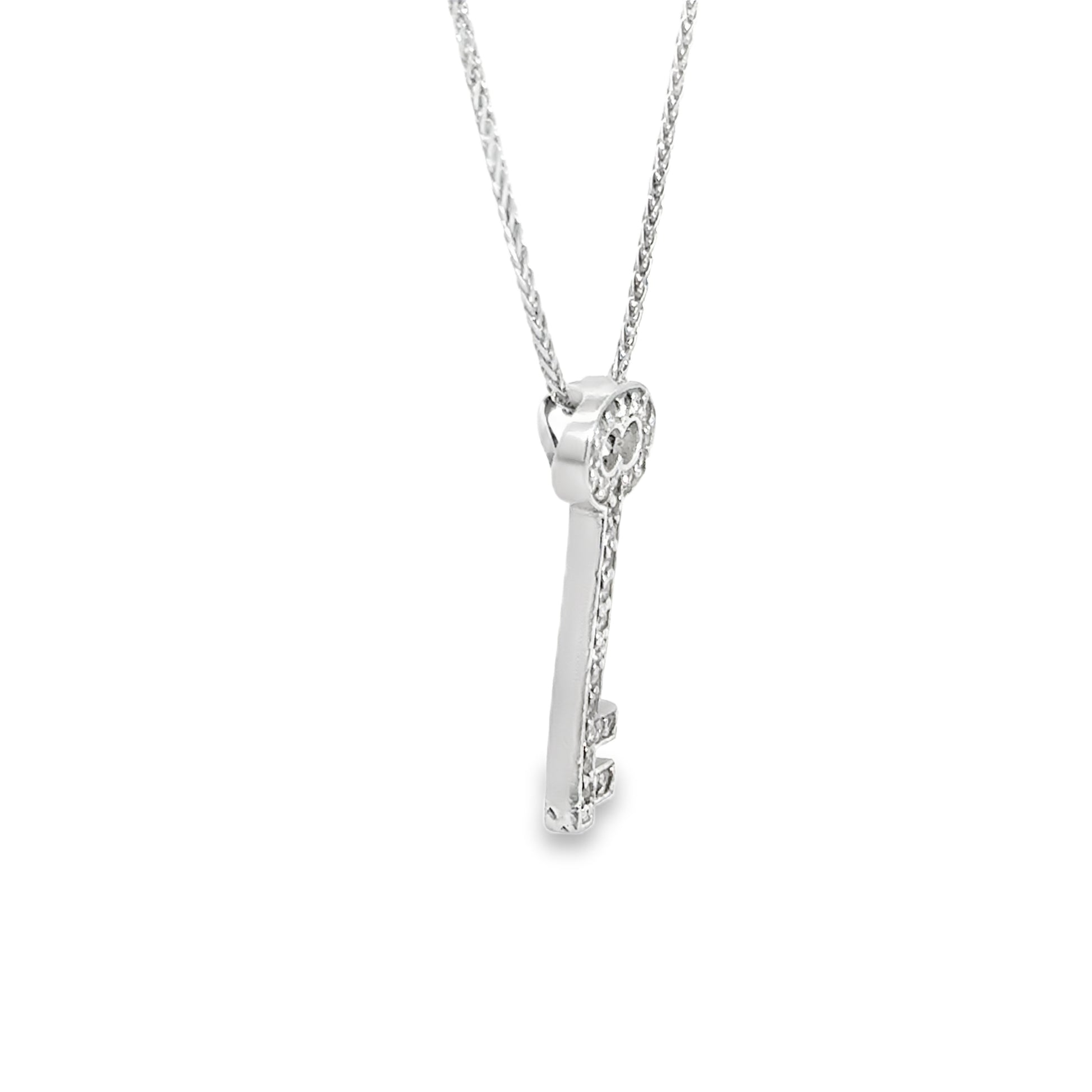 Unlock timeless elegance with this 14K white gold key pendant, beautifully adorned with shimmering round-cut diamonds. The classic key design features delicate pave-set diamonds that catch the light from every angle, adding a touch of sparkle to any ensemble. Suspended from a matching white gold chain, this necklace offers both symbolic charm and refined sophistication. A perfect gift or personal keepsake, this piece blends sentiment and style in a graceful silhouette. Chain included.