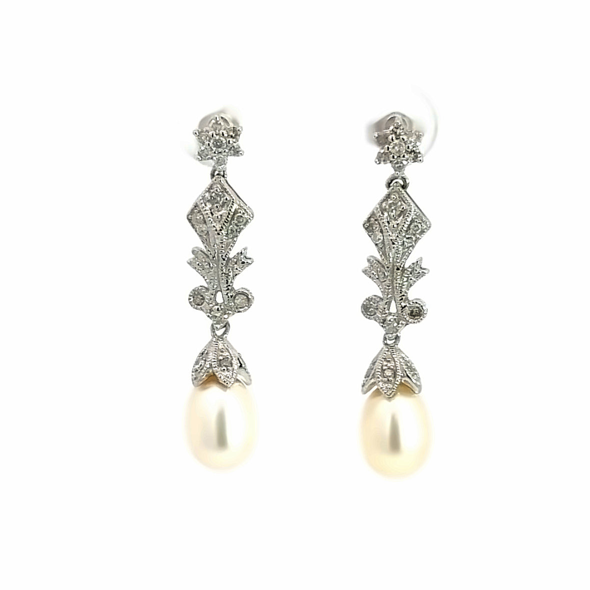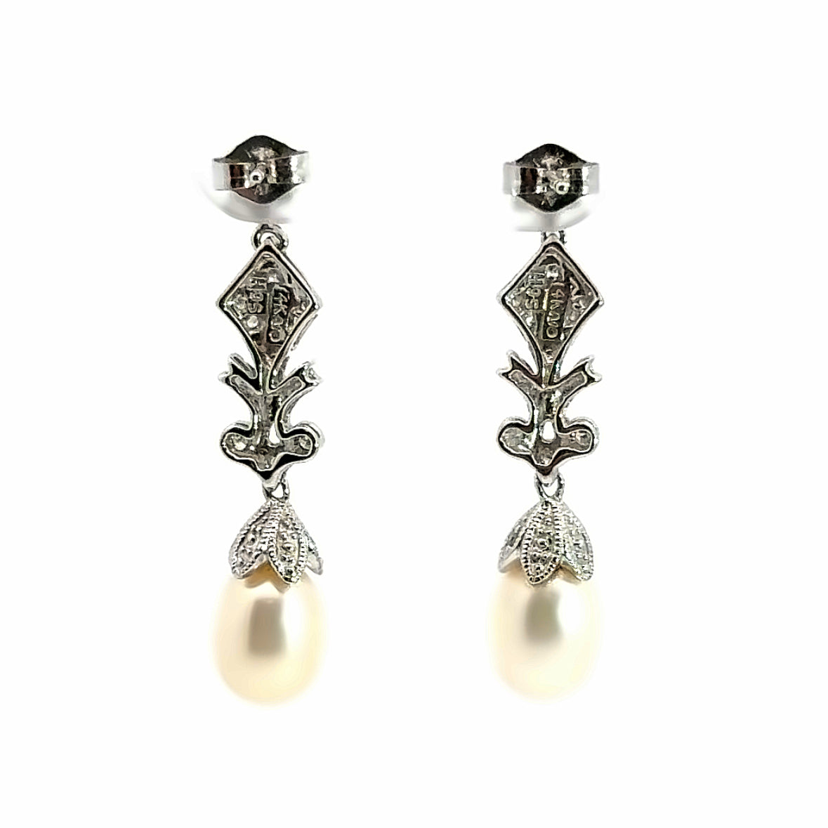 Elegant 14K White Gold Pearl Drop & Diamond Earrings
