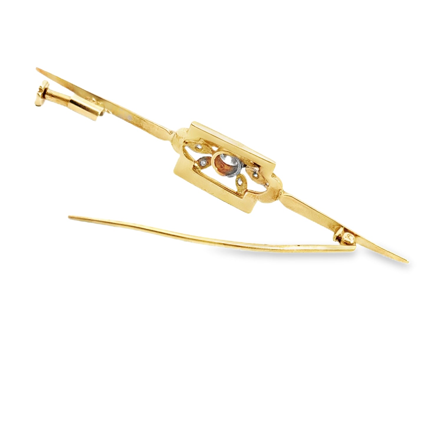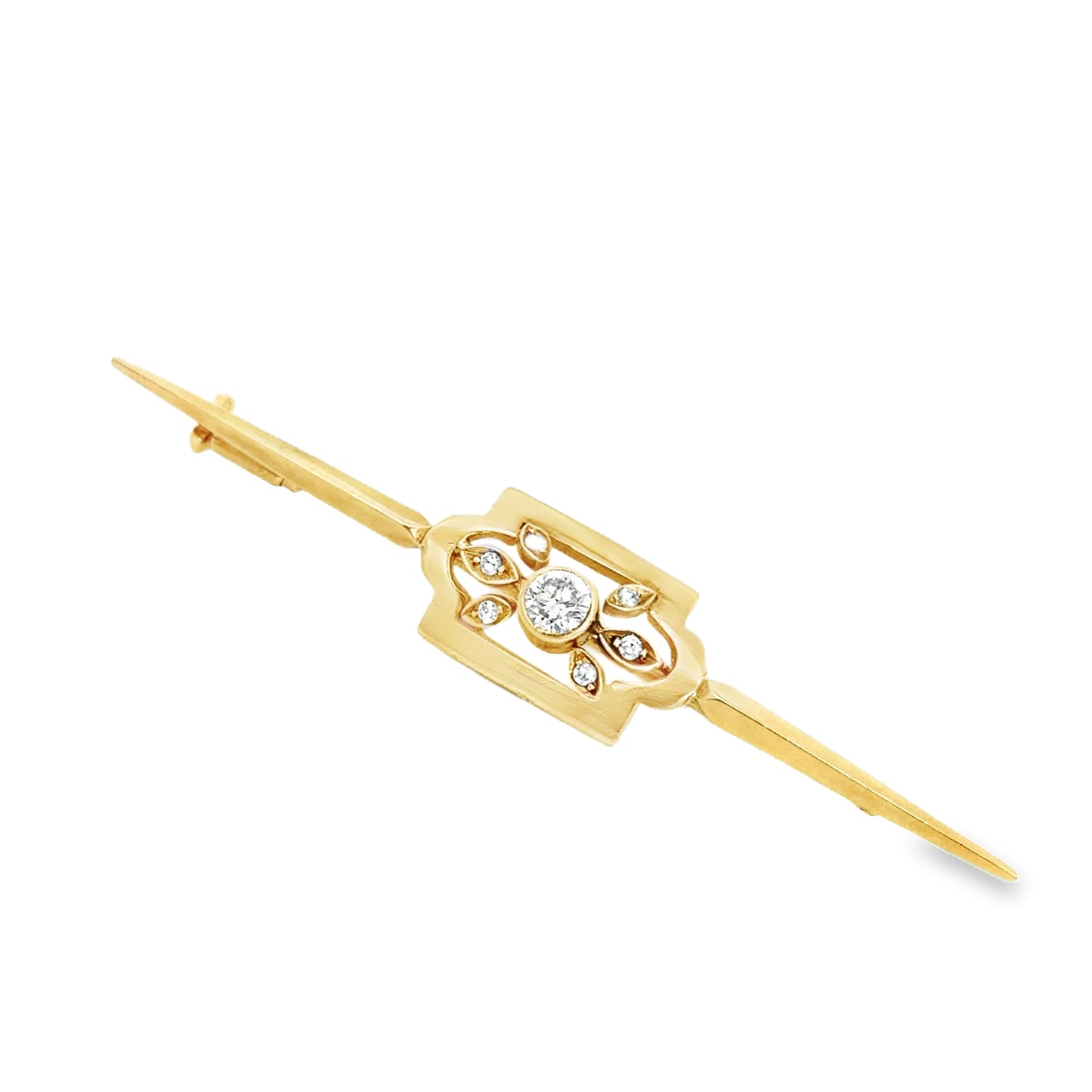 This retro 18k yellow gold bar pin features a striking geometric design, characteristic of the Art Deco to Mid-Century era, with a symmetrical openwork centerpiece adorned with brilliant-cut diamonds. The central diamond is bezel-set, surrounded by marquise-shaped and round accent diamonds arranged in a floral-inspired motif, adding a touch of elegance and sparkle. The elongated, tapered gold bar design enhances the pin’s sleek and sophisticated aesthetic, making it a refined statement piece. With its combination of bold structure and delicate detailing, this vintage brooch is a timeless representation of retro-era craftsmanship and luxury.