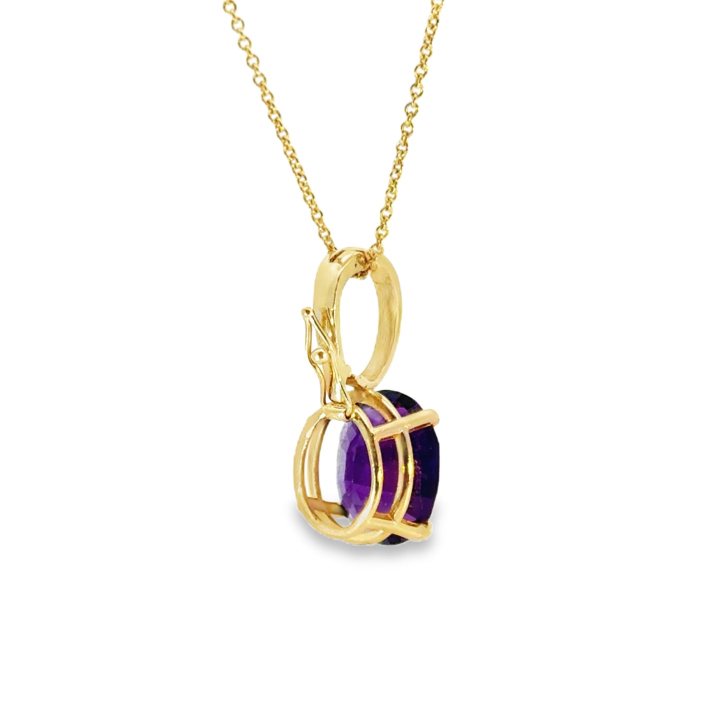 This elegant pendant features a rich, deep purple amethyst set in a classic 14k yellow gold setting. The oval-cut amethyst showcases excellent clarity and a vibrant hue, with facets that catch the light beautifully, creating a brilliant sparkle.
