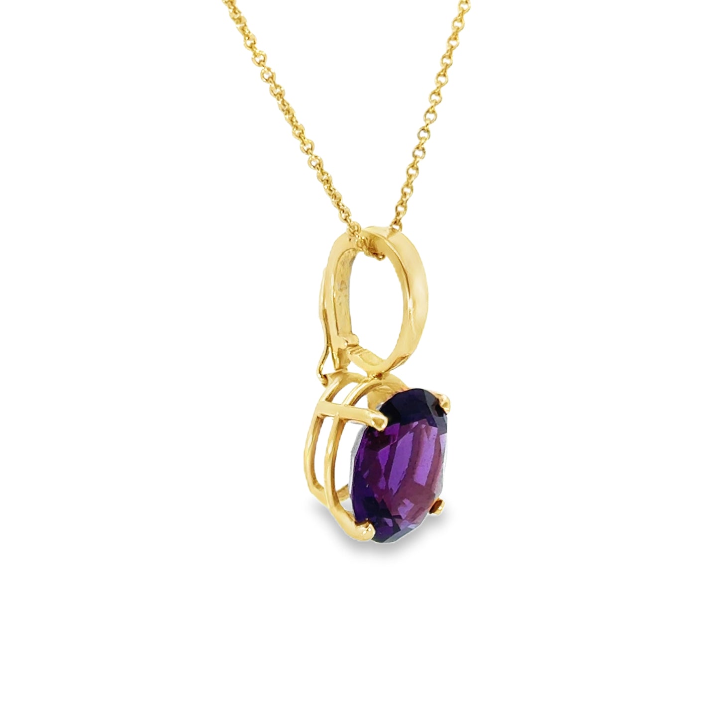Suspended from a sleek, polished gold bail, the pendant hangs gracefully on the chain, emphasizing its timeless and versatile style. The warm tone of the yellow gold contrasts perfectly with the cool, regal purple of the amethyst, making this pendant a stunning accessory for both everyday elegance and special occasions.