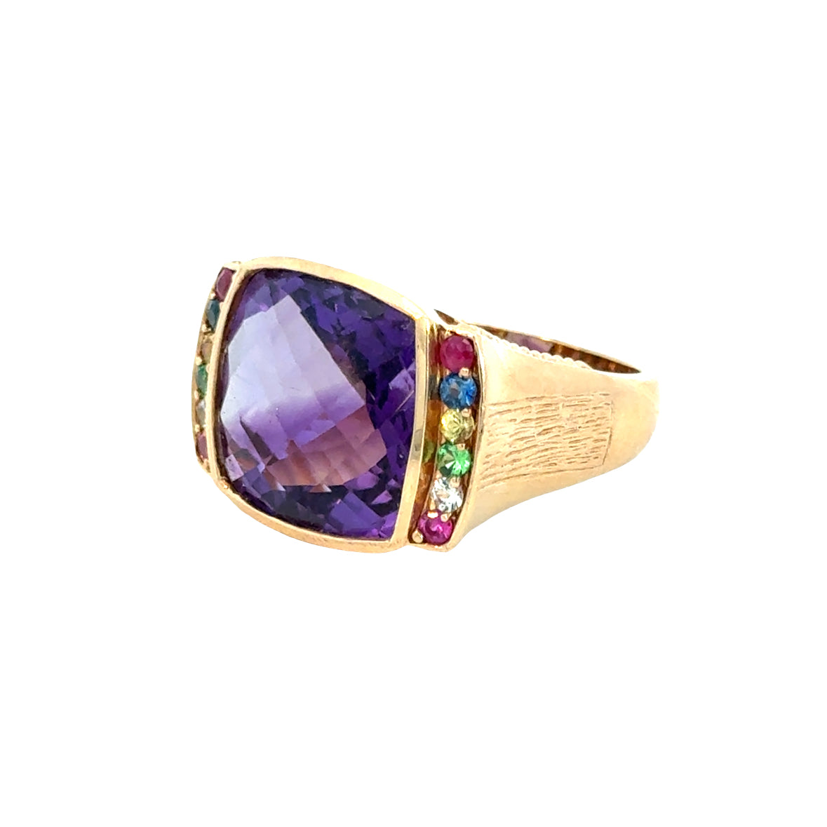 Adding to its charm, the shoulders are set with an array of multi-color gemstones — including green, blue, yellow, red, and white stones — creating a lively, rainbow-like accent on each side of the center stone. The wide band has a slightly brushed texture on the sides, adding an artisan touch and a comfortable fit.