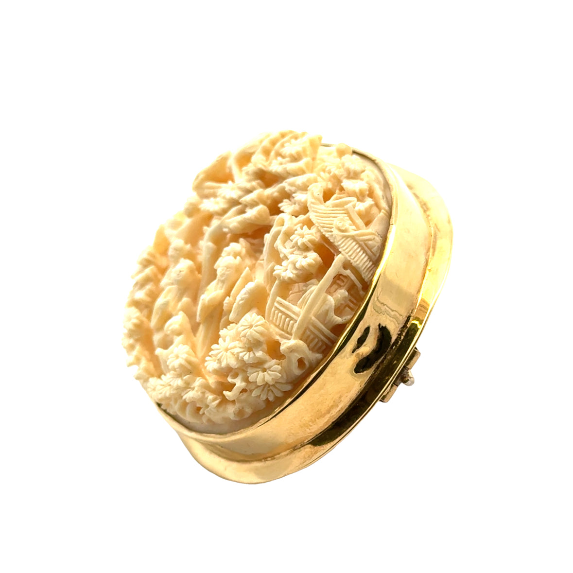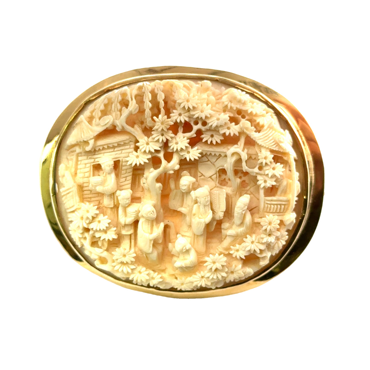 This large, intricate brooch from the 1800s features an exquisitely carved ivory scene depicting a detailed Chinese landscape with figures, trees, and traditional architecture. The high-relief carving showcases exceptional artistry and precision, characteristic of antique Chinese cameo work. The scene is set in a smooth 14k yellow gold frame, adding warmth and elegance to the piece. The brooch is secured with a sturdy pin clasp, ensuring both beauty and functionality. A rare and collectible piece, this brooch beautifully combines cultural artistry with fine jewelry craftsmanship, making it a standout addition to any antique collection.