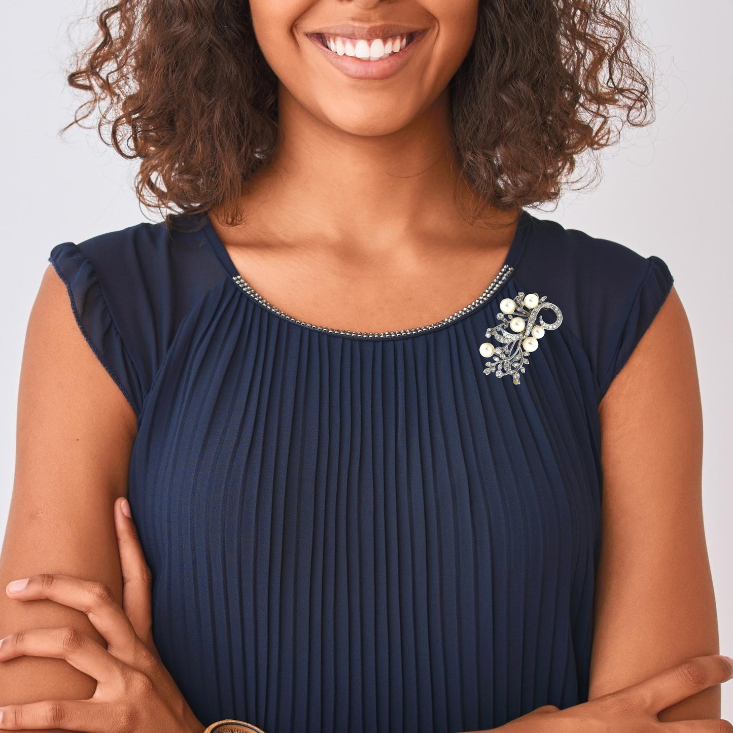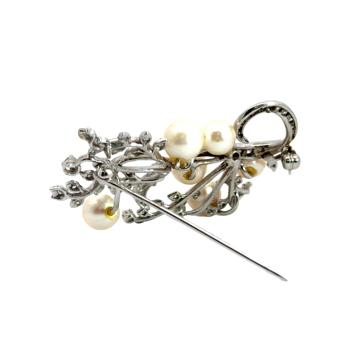 This exquisite platinum brooch features an elegant botanical-inspired design adorned with lustrous pearls and sparkling diamonds. The brooch showcases gracefully curved platinum branches, set with round brilliant-cut diamonds that add brilliance and sophistication. The design is accented by clusters of smooth, creamy pearls of varying sizes, artfully arranged to resemble blooming flowers or delicate berries. The combination of shimmering diamonds, soft pearls, and cool-toned platinum creates a timeless and luxurious aesthetic. With exceptional craftsmanship and intricate detailing, this brooch is a stunning statement piece, ideal for adding elegance and refinement to any ensemble.