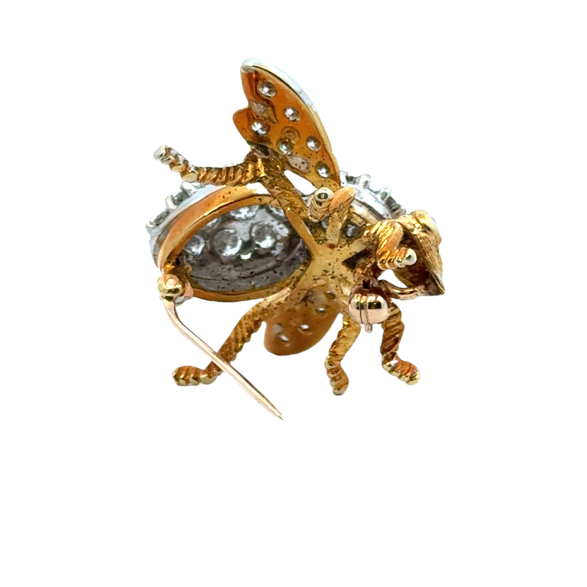 This exquisite Herbert Rosenthal brooch is crafted in 18k yellow gold and encrusted with dazzling diamonds, creating a lifelike and luxurious bee design. The intricate body and wings of the bee are fully pavé-set with brilliant-cut diamonds, adding a radiant sparkle to the piece. The delicate ruby-set eyes provide a striking contrast, enhancing the brooch’s charm and attention to detail. The textured gold legs and finely modeled head further showcase the craftsmanship that Rosenthal is known for. This elegant brooch is not only a statement of luxury but also a collectible piece of fine jewelry art.