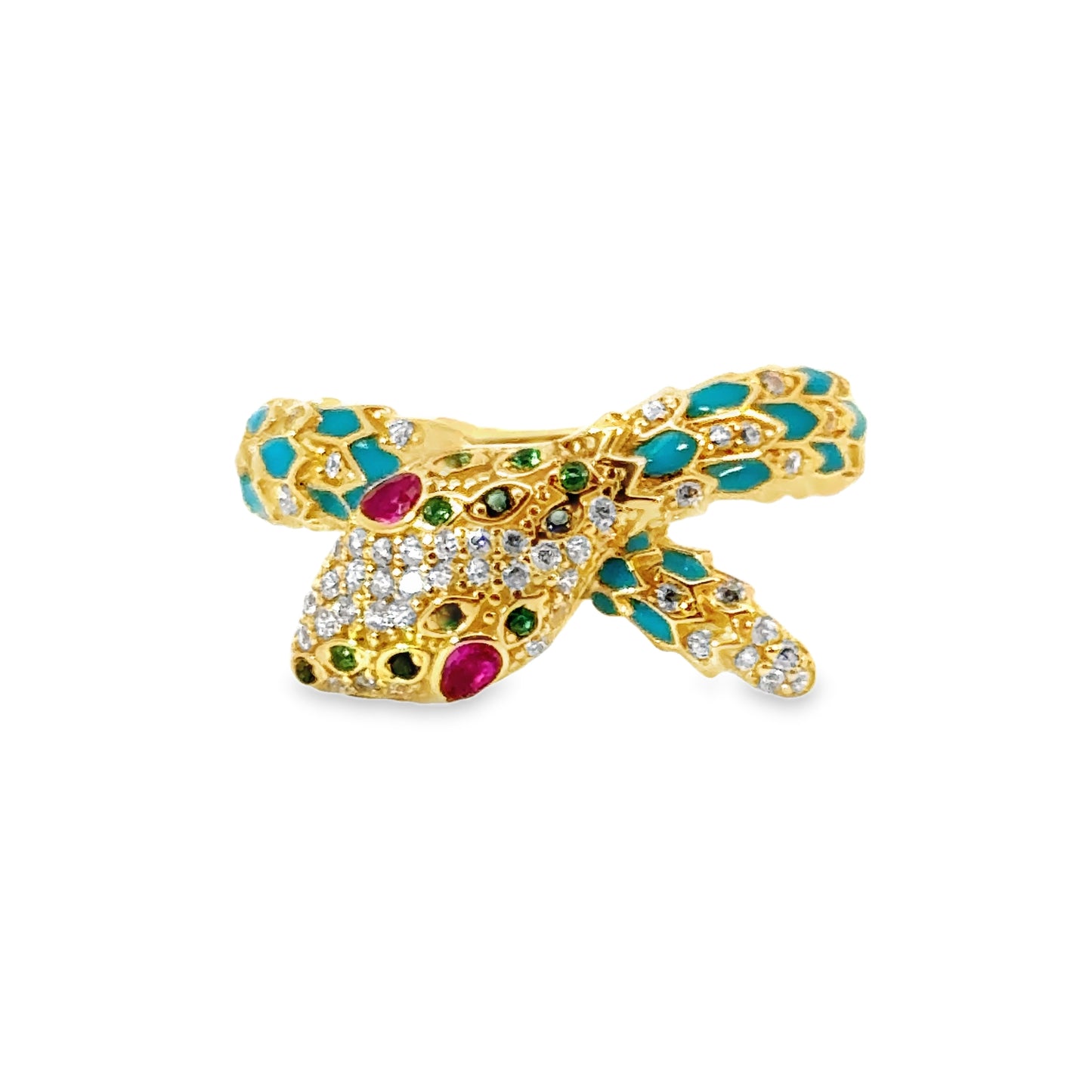 In Victorian style, discover the allure of mystique with this unique serpent bangle. Crafted with 21K yellow gold and embellished with sparkling cubic zirconia, rubies, and emeralds. In addition, the beautiful turquoise enamel hues are stunning. This bracelet is a symbol of old world charm and elegance.