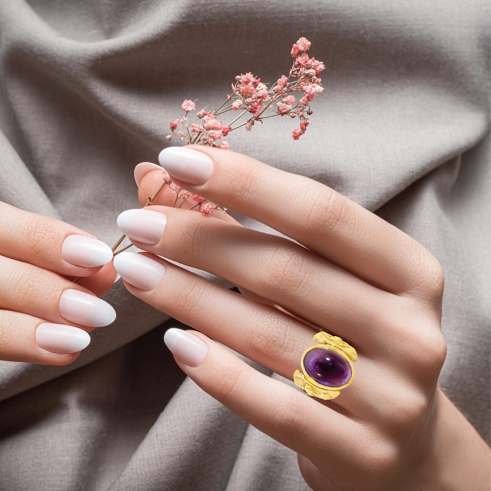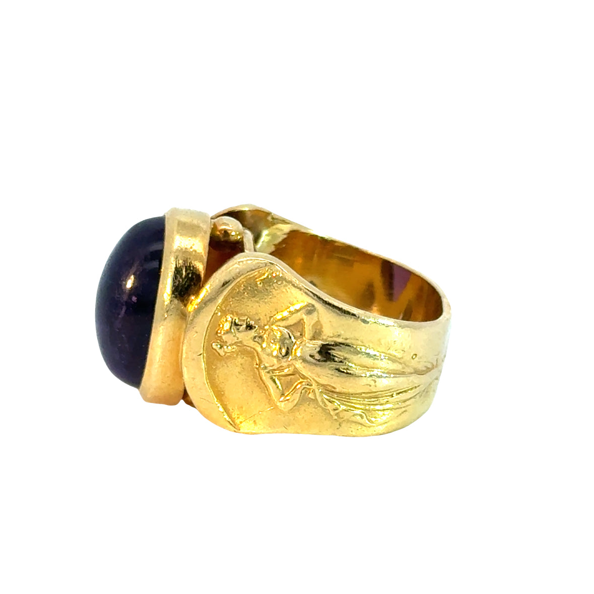 This striking statement ring is crafted in luxurious 18K yellow gold and features a rich, deep-purple cabochon amethyst as its centerpiece. The smooth, bezel-set gemstone is complemented by beautifully detailed relief figures on each side of the band, evoking classical elegance. The interior is stamped “ATHENA” and “18K,” affirming its quality and craftsmanship.