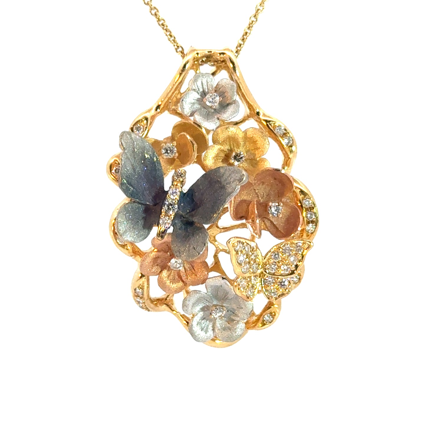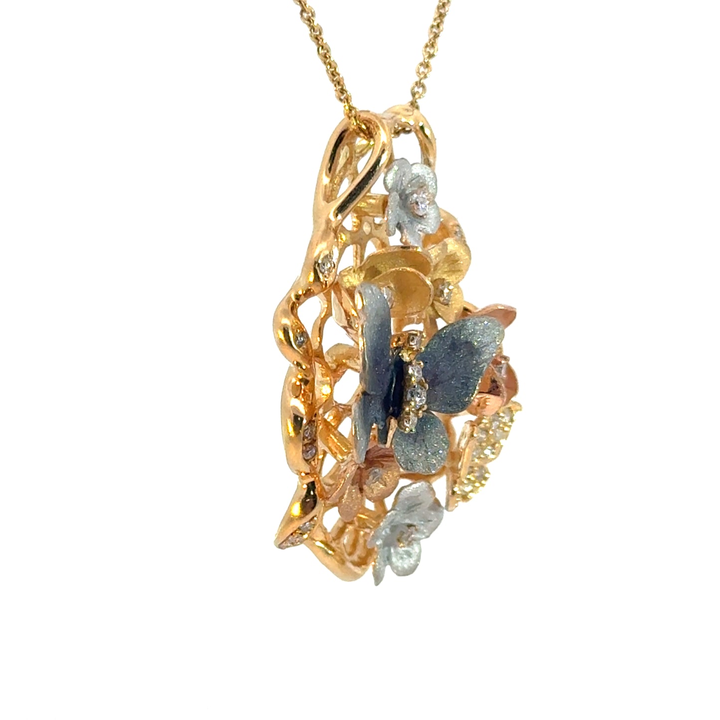 This is a stunning pendant crafted from 18k yellow gold, showcasing an intricate floral and butterfly motif. The front design features delicately crafted flowers in shades of yellow, rose, and gray enamel, accented with sparkling diamonds at their centers. Two prominent butterflies are highlighted: one with vibrant gray enamel wings and a diamond-studded body, and the other adorned entirely with pave-set diamonds, adding brilliance and contrast.