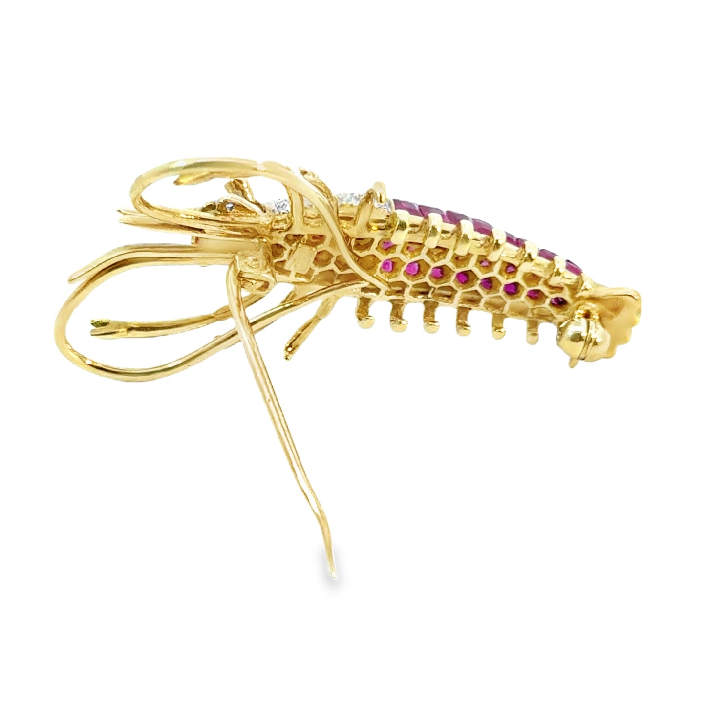 This is a stunning 18k yellow gold brooch designed in the form of a stylized lobster or shrimp, showcasing exceptional craftsmanship and luxurious details. The brooch features a vibrant array of invisibly set rubies on the body, arranged seamlessly to create a sleek and radiant appearance. The rich red hue of the rubies contrasts beautifully with the warm yellow gold.