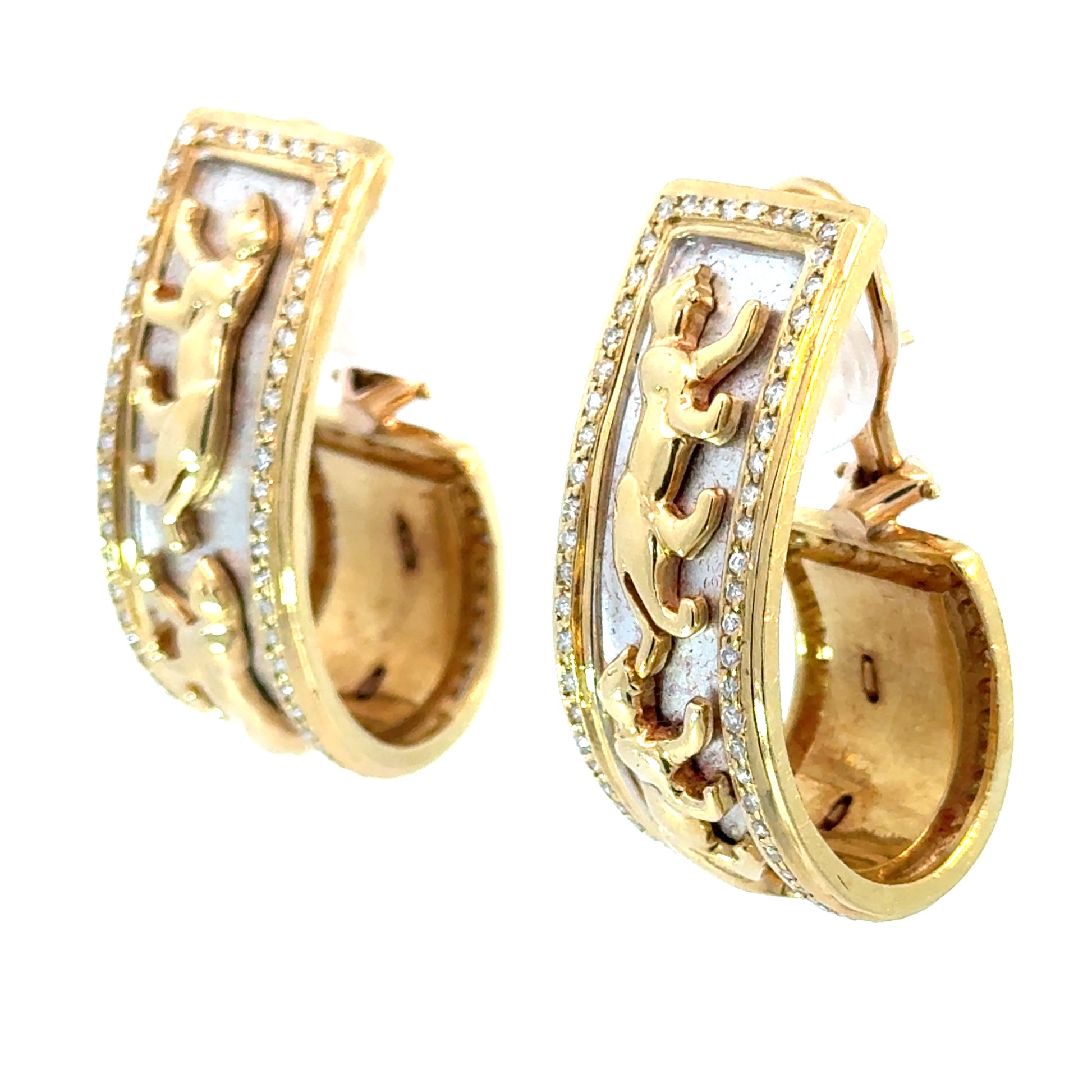 Striking and luxurious, these 18K yellow gold hoop earrings feature sculptural gold panther motifs set against a softly textured white gold ground, framed by rows of sparkling diamonds along each edge. The panthers are rendered in high relief, creating dramatic depth and movement, while the diamond borders add brilliance and refinement.