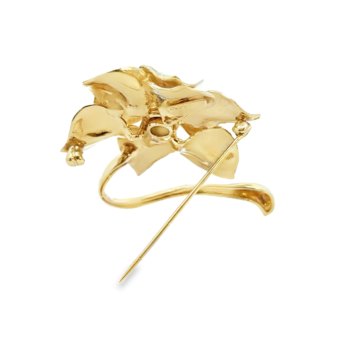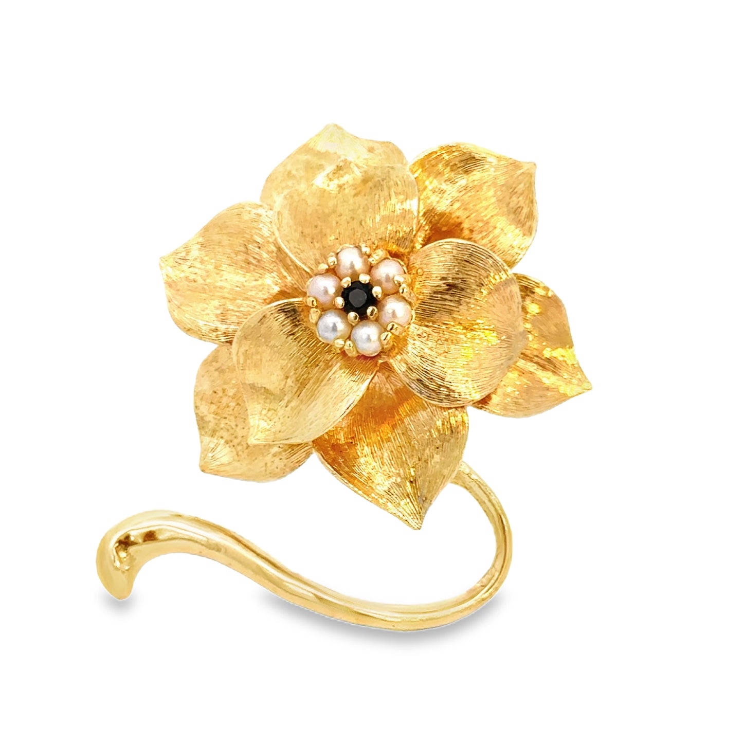 This 14K yellow gold brooch showcases a delicately crafted floral design. The flower features textured gold petals, intricately detailed to create a lifelike appearance with a subtle shimmer. At the center of the bloom is a cluster of small pearls encircling a striking black onyx bead, adding contrast and depth to the design. The stem curves elegantly beneath the flower, enhancing the piece’s graceful aesthetic. This brooch exudes timeless sophistication, making it a versatile accessory for both vintage enthusiasts and modern jewelry collectors.