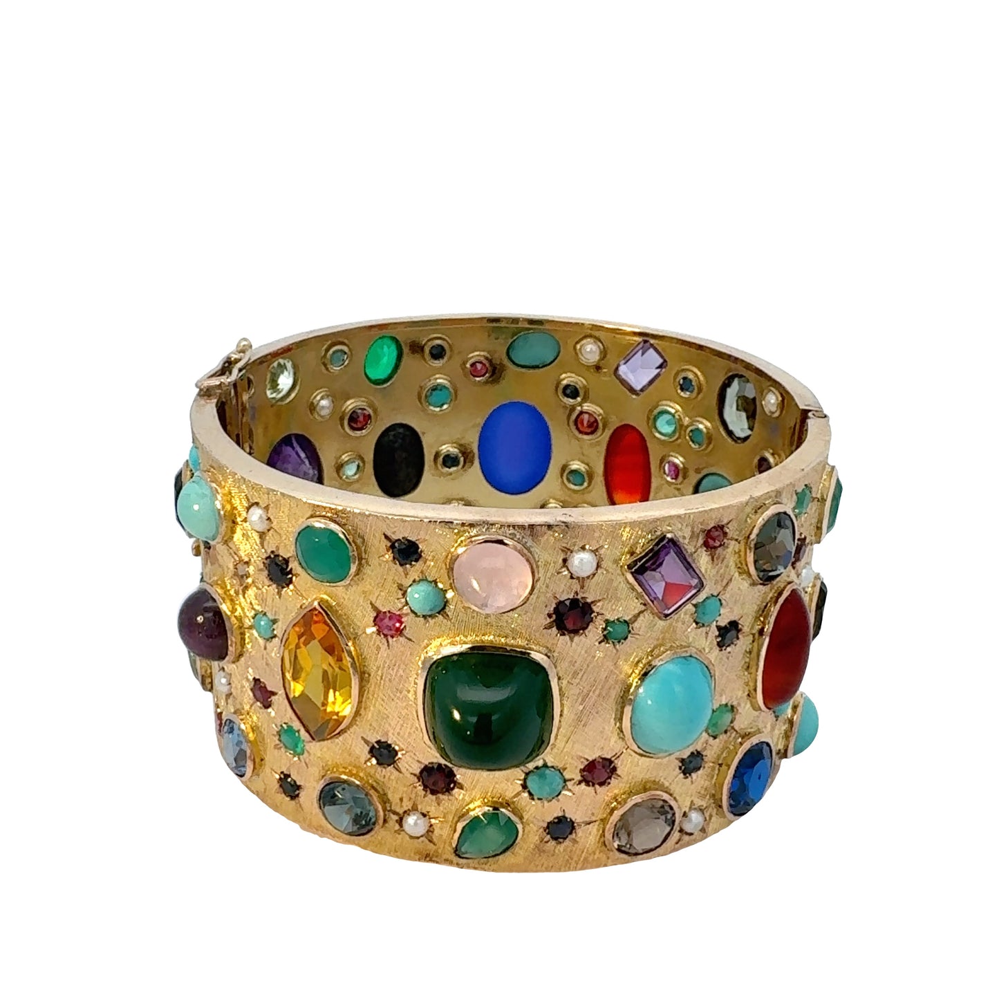 Stunning 14K textured yellow gold multi-stone, multi-color bangle. This large bangle is a true artistic showpiece, boasting an artistic arrangement of colorful stones that are bezel set for a sleek look. Two hinged panels are held together by a tongue clasp. This piece is sure to make a statement wherever you go.