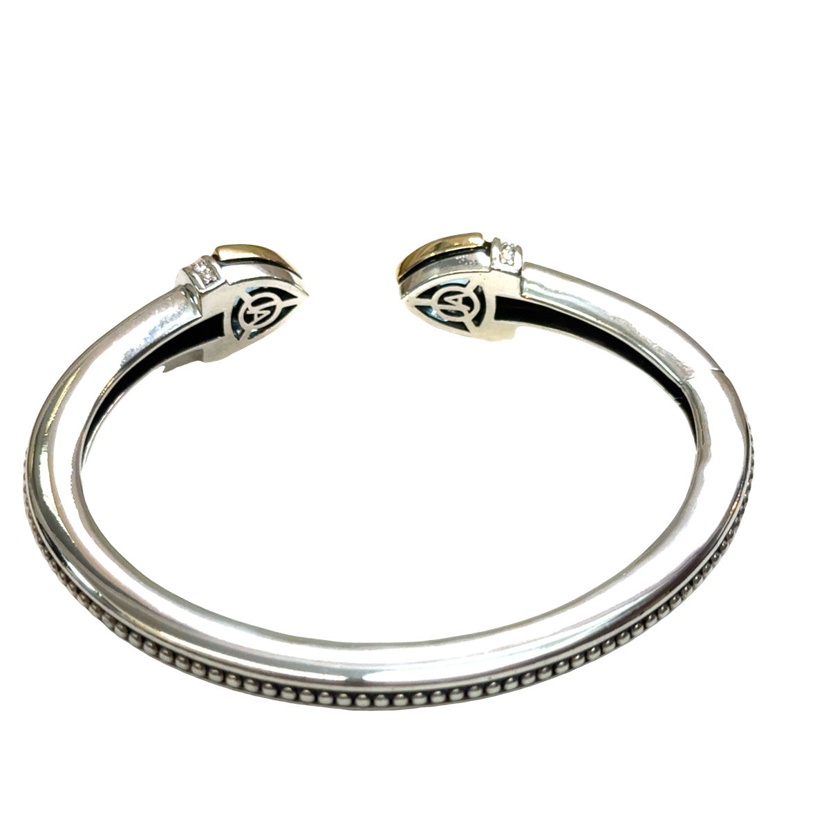 Make a statement with this exquisite designer cuff bangle by John Atencio, showcasing his signature balance of bold artistry and refined luxury. Expertly crafted in solid sterling silver with 14K yellow gold accents, this open cuff bangle features two trillion-cut blue topaz gemstones at each end, bezel-set and framed in warm gold for striking contrast.