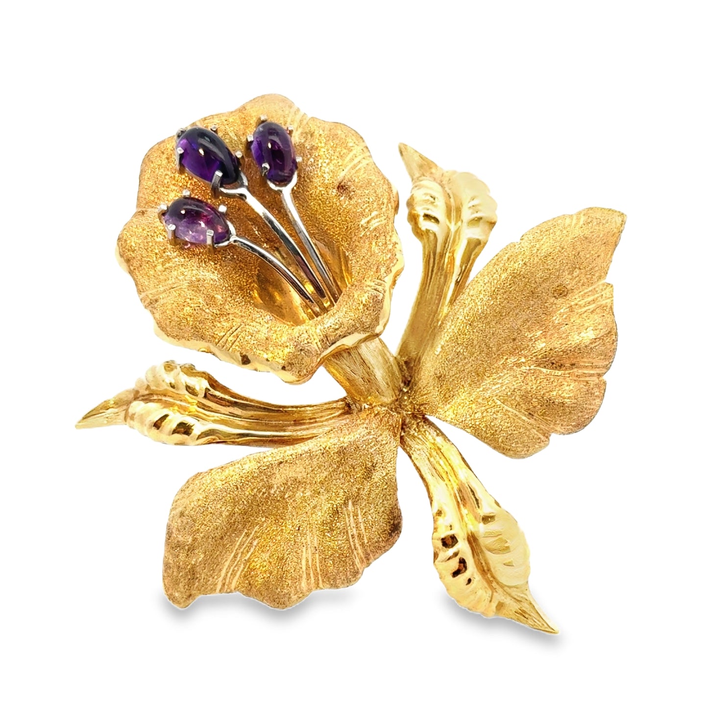 At the center of the flower are three amethyst cabochons, representing the lily’s stamen, set in white gold prongs for a contrasting touch. The deep purple of the amethysts adds a vibrant pop of color against the rich yellow gold. This brooch is large, making it a bold statement piece that embodies the elegance and charm of retro jewelry design. Perfect for collectors or as a unique accessory to elevate any outfit.