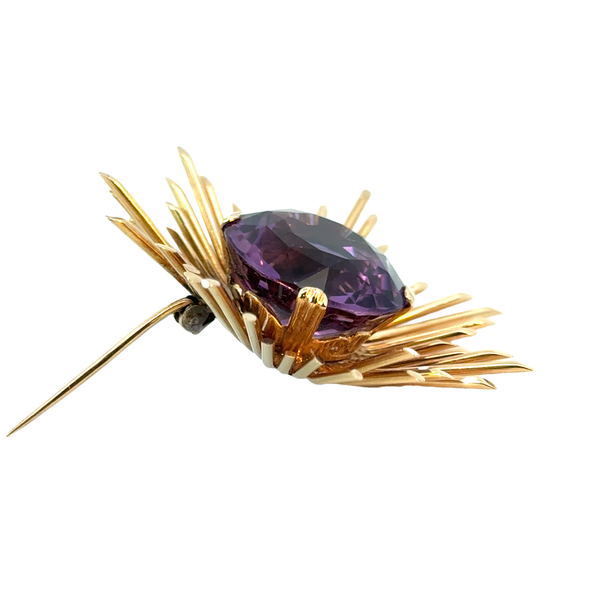 The rose gold setting enhances the warmth of the design while complementing the deep purple of the amethyst. The combination of the dynamic sunburst motif and the bold central gemstone makes this brooch a statement piece, ideal for adding a touch of glamour to formal attire. Its timeless design showcases exceptional craftsmanship and luxurious materials, making it a treasured addition to any jewelry collection.