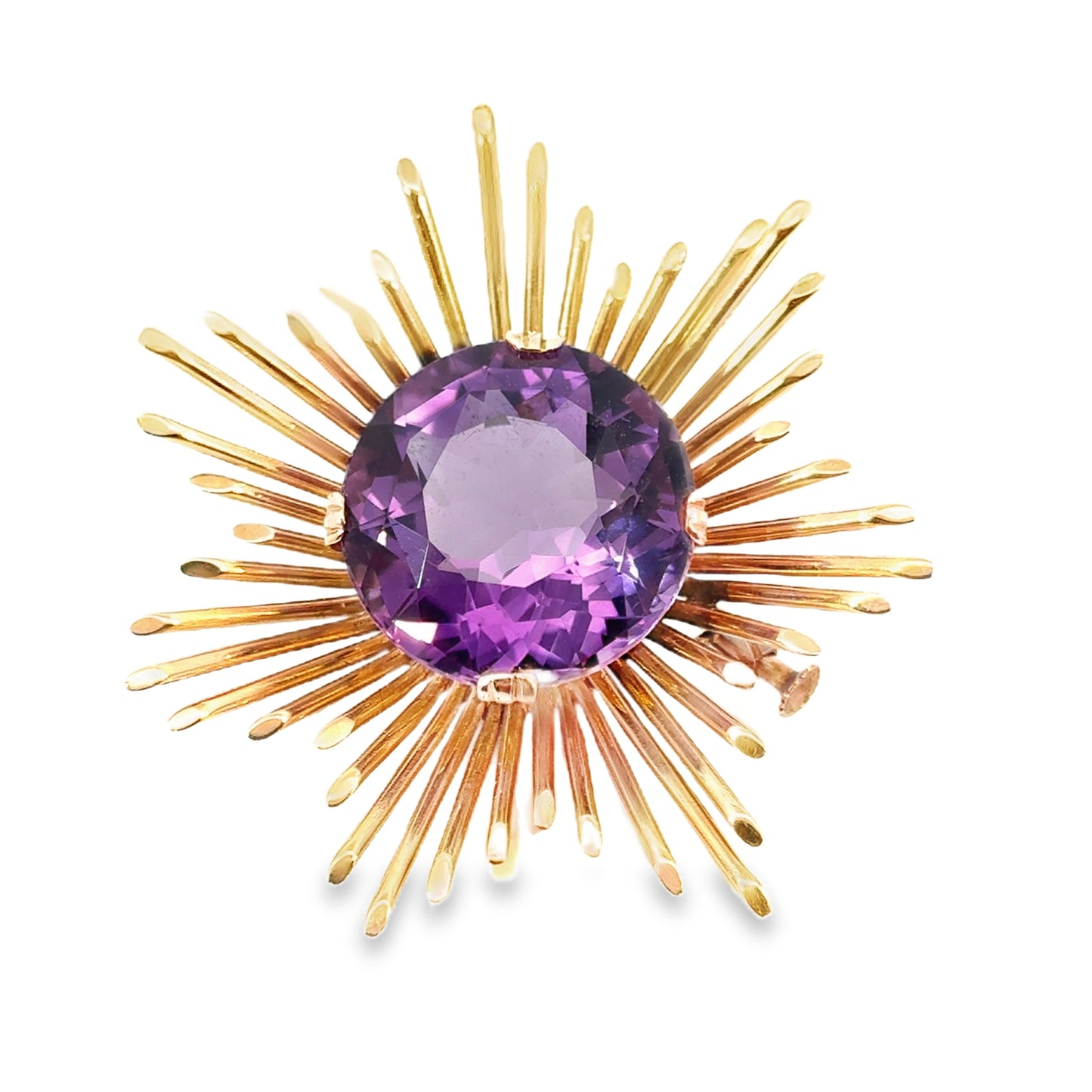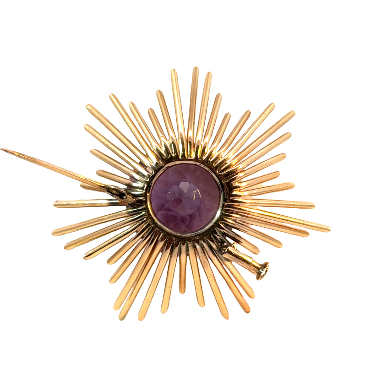 This stunning brooch is crafted from 18k rose gold and features a vibrant, round-cut amethyst as its centerpiece. The amethyst boasts a rich purple hue with excellent clarity, exuding elegance and sophistication. Surrounding the gemstone is a radiant burst of slender, polished gold spokes, designed to mimic the appearance of a sunburst.