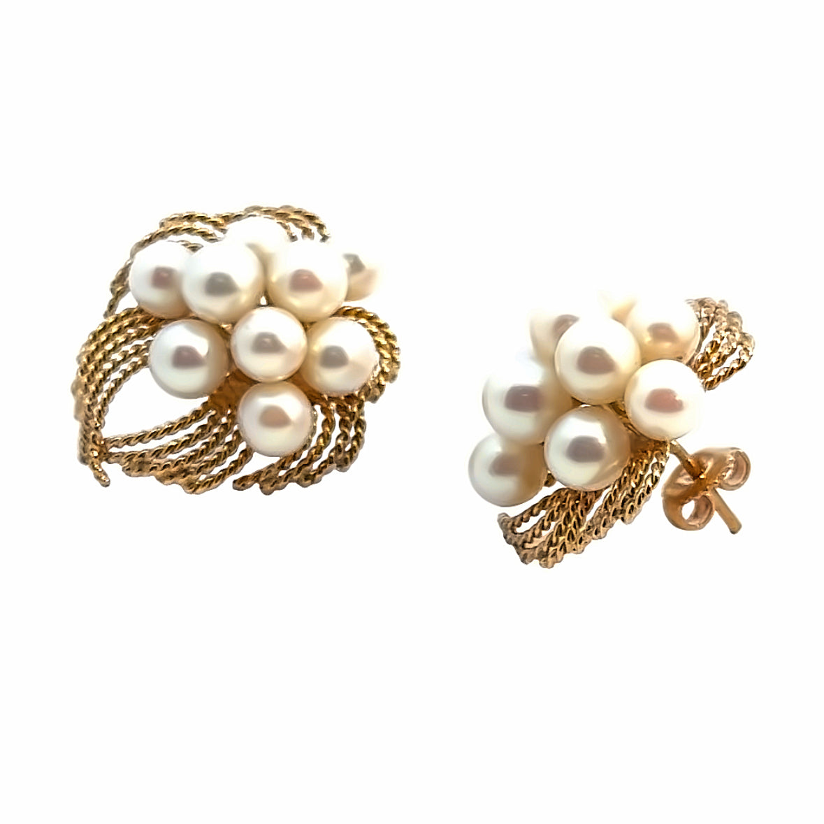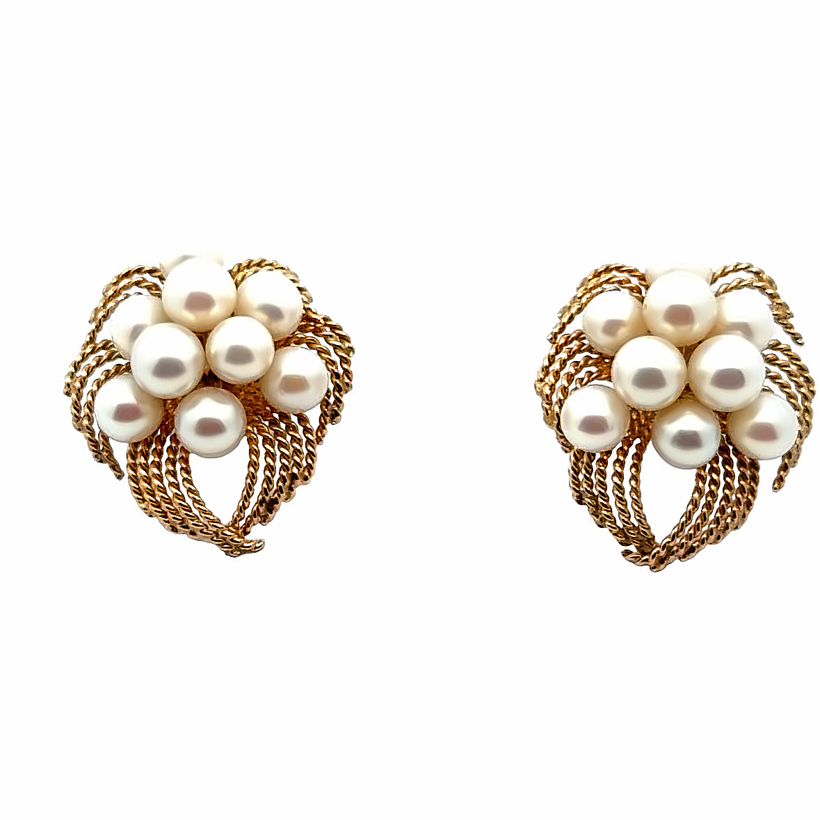 Exquisite 14K rose gold rope design pearl earrings. Crafted with precision and care, these earrings feature AAA pearl clusters that shimmer and shine with beauty. The ornate rope design, reminiscent of a feather, adds a unique and fun shape to these estate earrings making them a rare find.