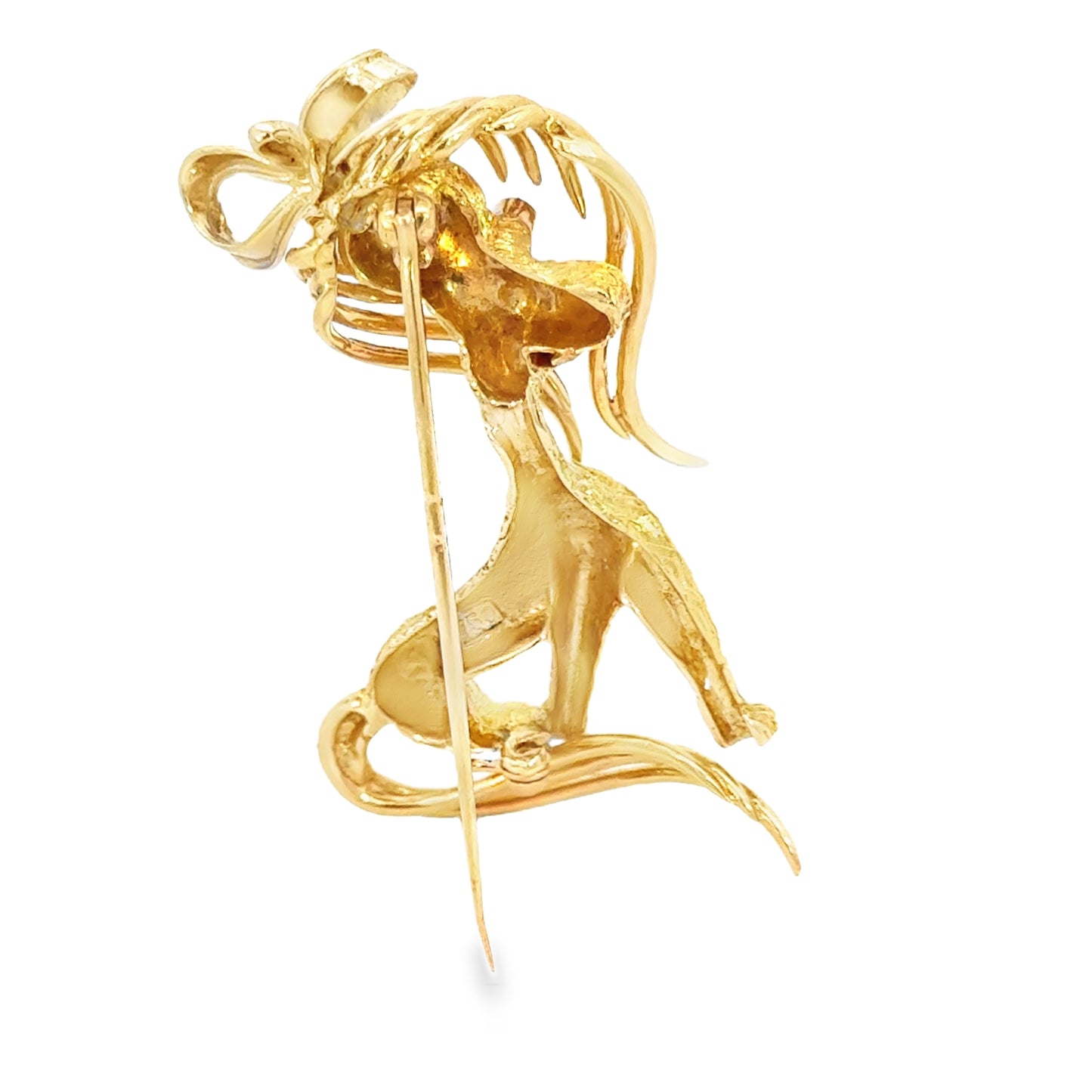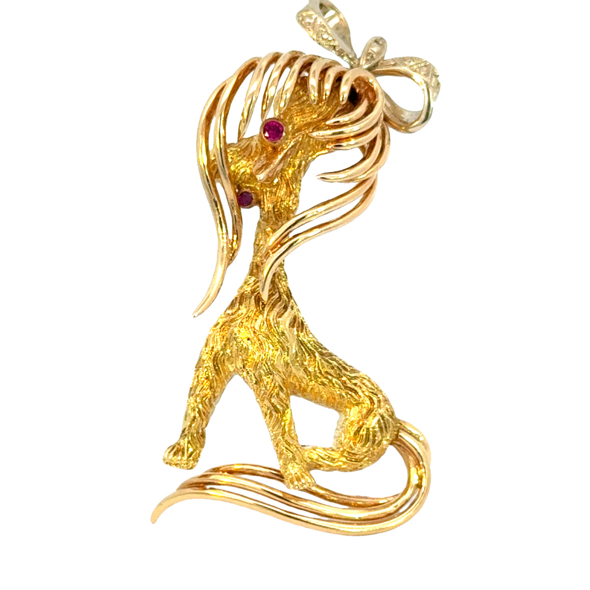 This 18k yellow gold brooch features a charming depiction of a dog with intricate detailing. The textured gold body highlights the dog’s fur, adding depth and lifelike movement. The dog’s long, flowing ears and tail are accented with smooth, polished gold, creating a delightful contrast to the textured body. Two vibrant rubies are set as the dog’s eyes, adding a playful sparkle and color to the piece. A delicate bow atop the dog’s head, crafted in white gold, adds a whimsical touch of elegance. This brooch is both playful and sophisticated, making it a unique statement accessory.