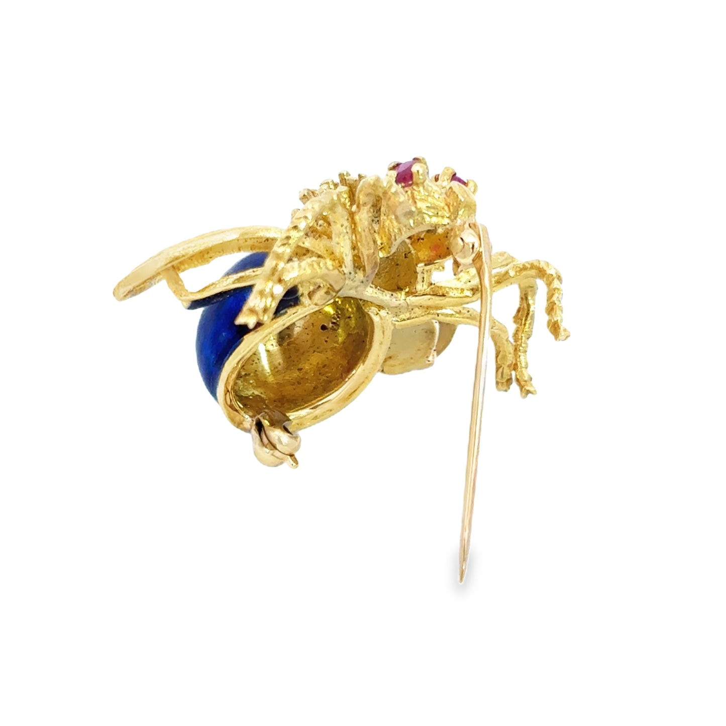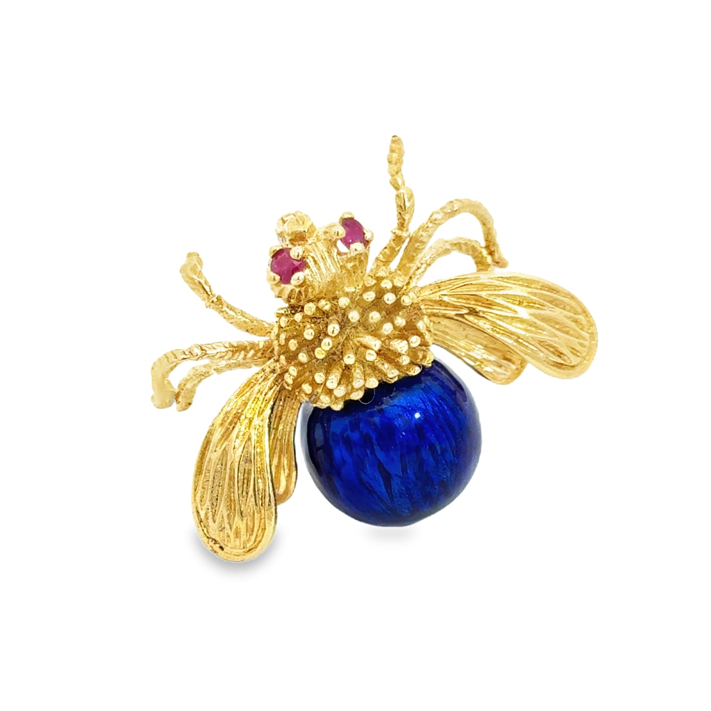18K Yellow Gold Blue Enamel & Ruby Bee Brooch