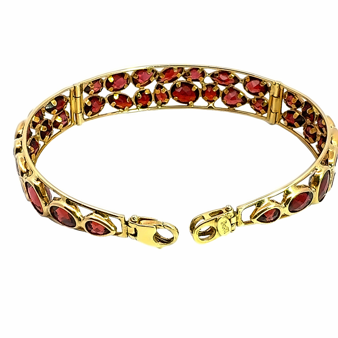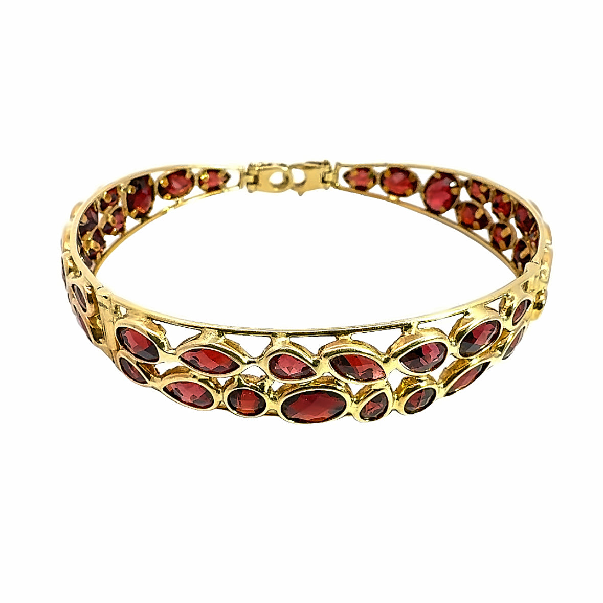 Indulge in this beautiful 18K gold bangle with rich red garnet gemstones. Each gemstone is elegantly set to create a harmonious symphony of color and light. A lady is bound to feel sophisticated and elegant wearing this beautiful jewelry.
