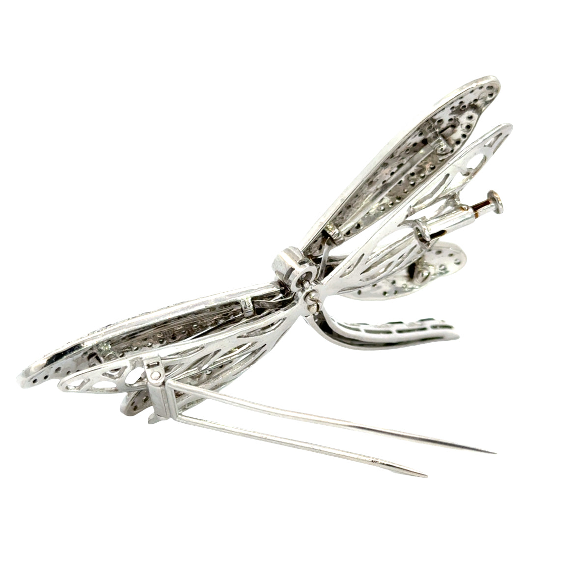 A beautiful feature of this brooch is that the wings have a gentle, natural movement/bounce, giving the dragonfly a realistic, dynamic feel when worn—an elevated touch of craftsmanship rarely seen in modern pieces. The tail features alternating diamond and enamel segments, adding striking contrast and flow.