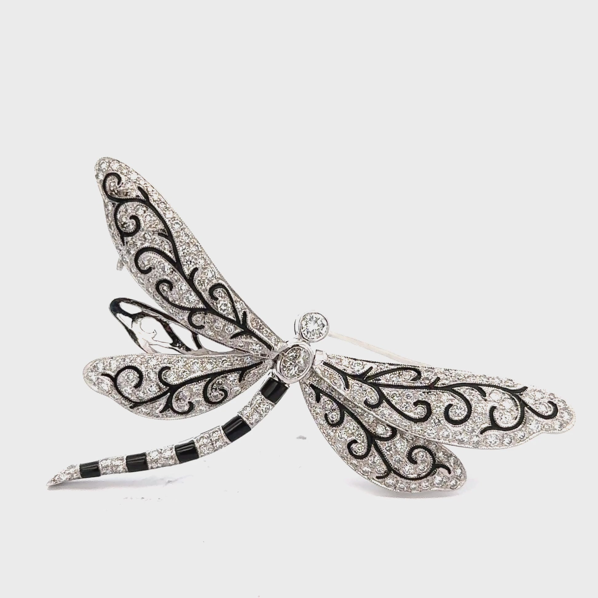 A breathtaking statement piece, this exquisitely crafted 18K white gold dragonfly brooch showcases exceptional detail, artistry, and brilliance. The wings are meticulously pavé-set with sparkling diamonds totaling approximately 5.47 carats, accented with elegant black enamel scrollwork that enhances the delicate, lifelike design.