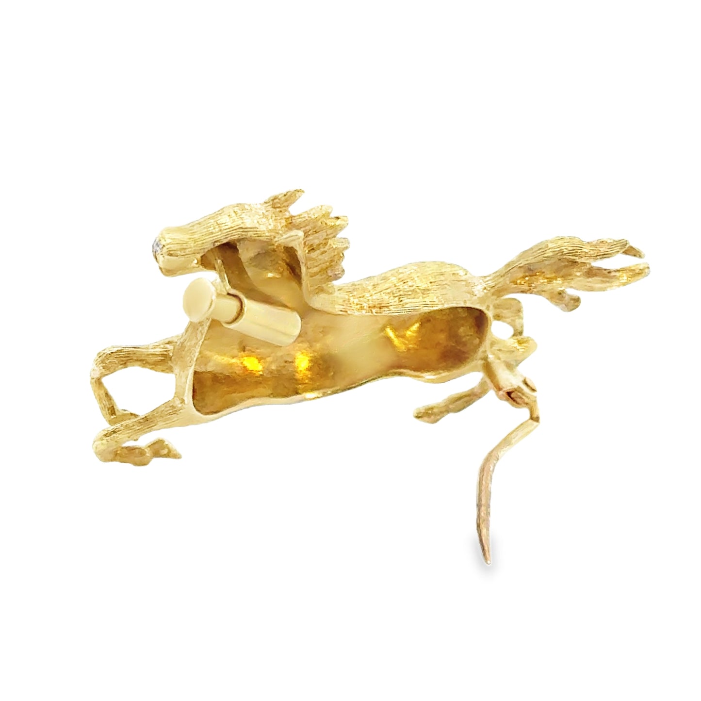 This is a dynamic and elegant 18k yellow gold brooch crafted in the shape of a galloping horse. The piece showcases exquisite detailing, with textured gold creating a lifelike representation of the horse’s muscular form and flowing mane. The design captures the horse in mid-stride, conveying a sense of motion and vitality.