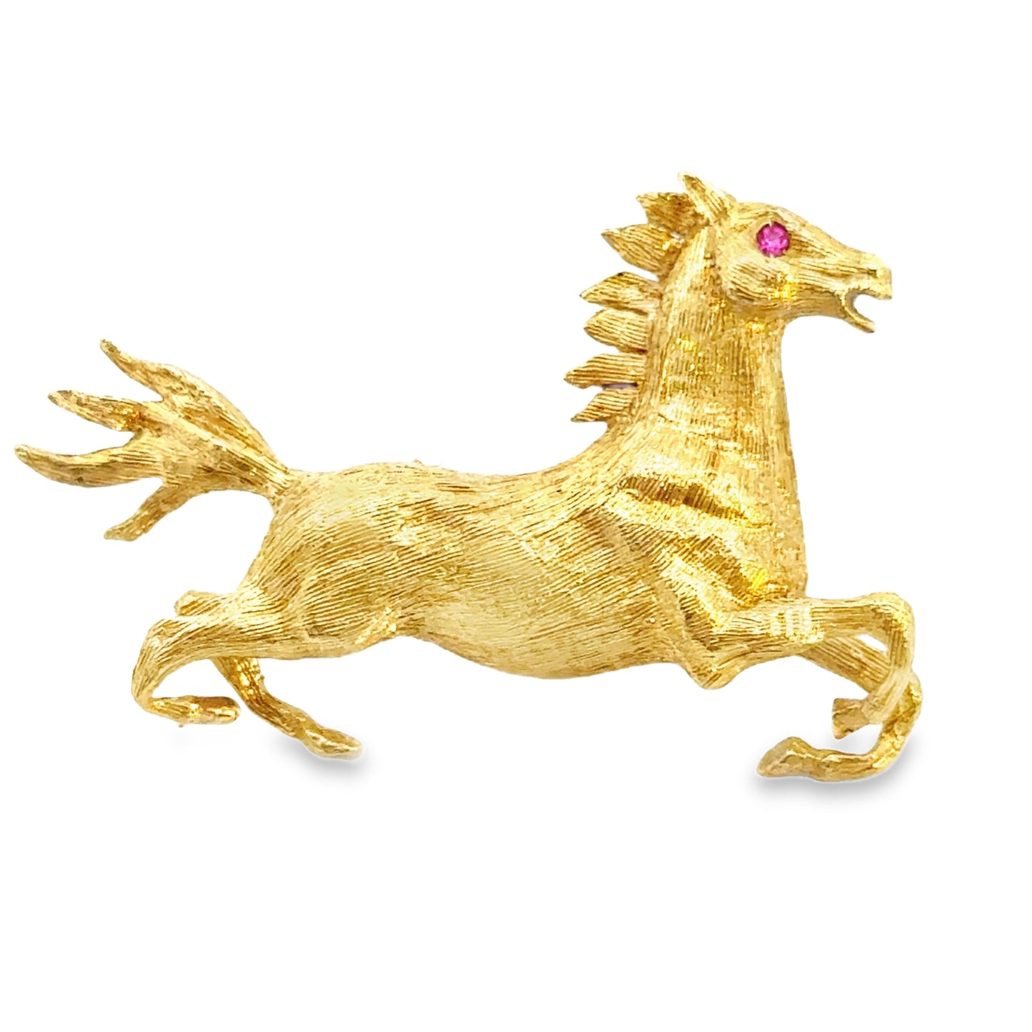 18K Yellow Gold & Ruby Galloping Horse Brooch