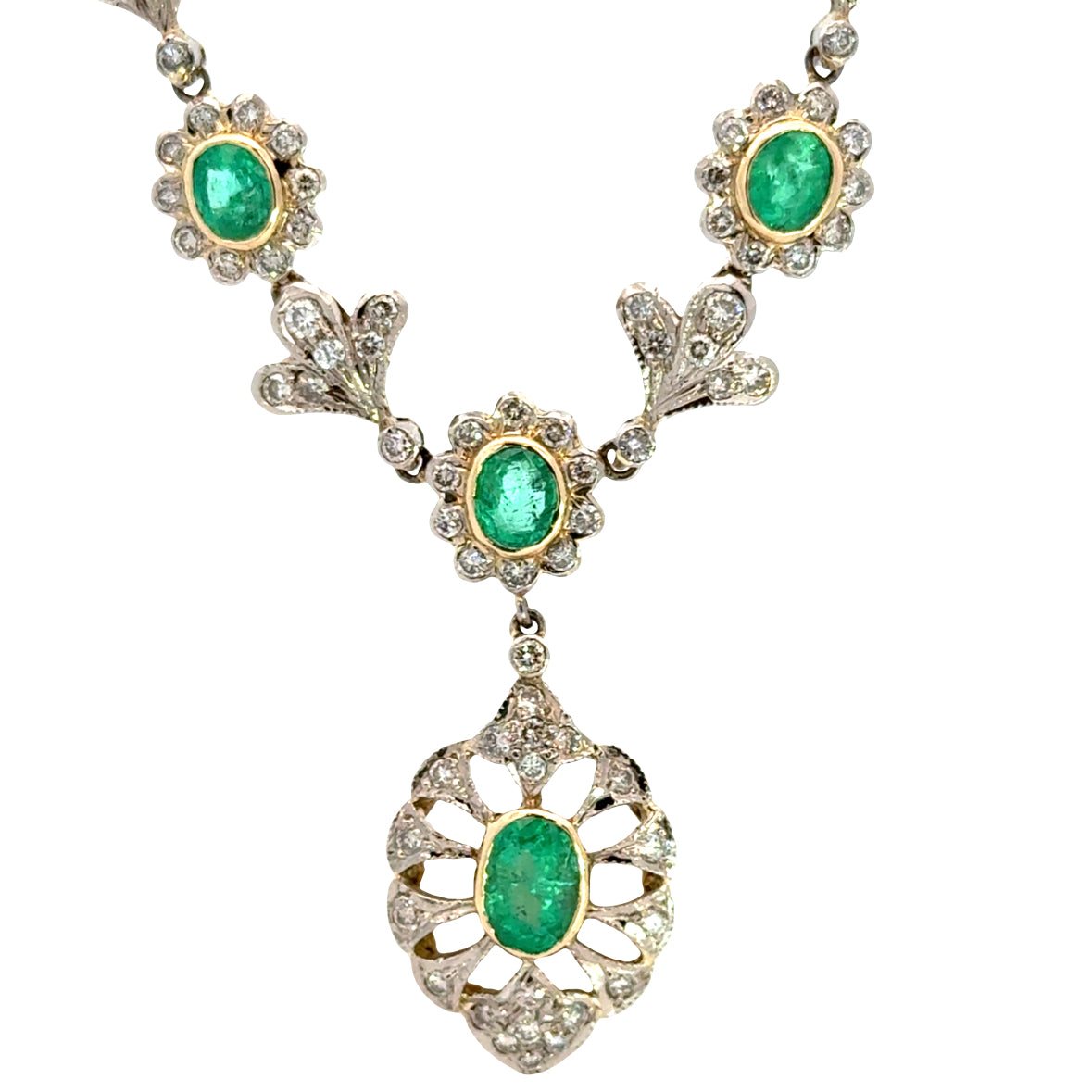 The design showcases three vibrant oval emeralds totaling approximately 1.89 carats, each framed in delicate diamond halos. Flowing upward along the neckline are diamond-set leaf motifs that create a refined, organic silhouette. The centerpiece suspends a beautifully detailed openwork drop, accented with an additional oval emerald surrounded by sparkling diamonds totaling approximately 1.95 carats.