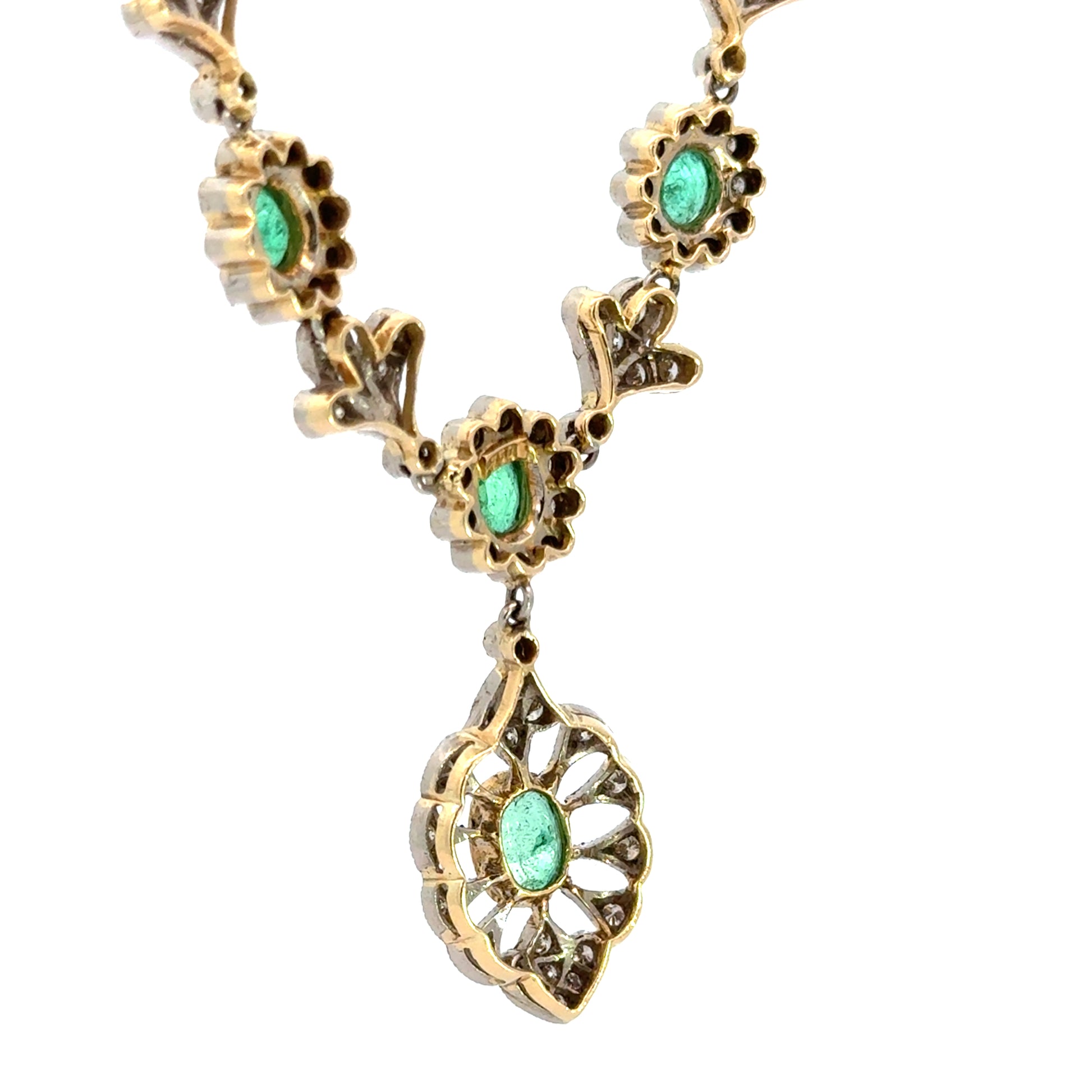 An elegant and romantic 18K yellow gold emerald and diamond necklace featuring a graceful botanical motif and articulated drop pendant.