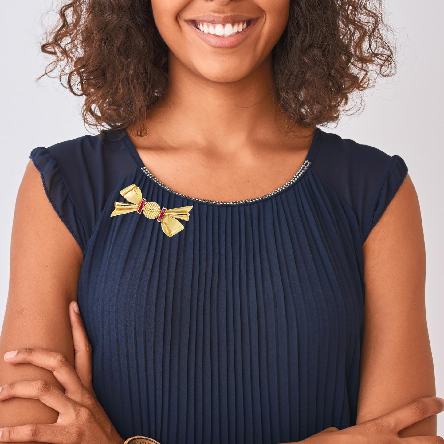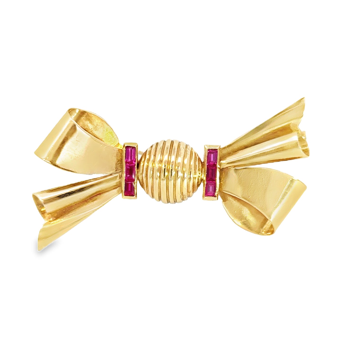 This elegant 18k rose gold brooch is designed in the shape of a stylized bow, exuding timeless sophistication and charm. The centerpiece features a textured, ribbed gold sphere flanked by two bands of vivid baguette-cut rubies, which add a bold splash of color and contrast to the polished gold surface. The bow’s wide, gracefully folded ribbons create a dynamic and dimensional look, showcasing exceptional craftsmanship and artistry. With its clean lines and geometric details, this brooch combines vintage style with a refined, luxurious aesthetic, making it an ideal accessory for any occasion.
