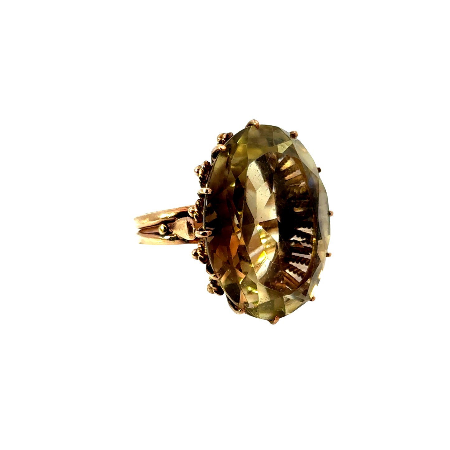 Introducing our showstopper: an exquisite 18K yellow-green topaz ring, showcasing a captivating large stone nestled in a beautiful vintage basket setting. Prepare to be enchanted as this mesmerizing gemstone takes center stage, reflecting an alluring fusion of yellow and green hues that effortlessly captivate the beholder's gaze.