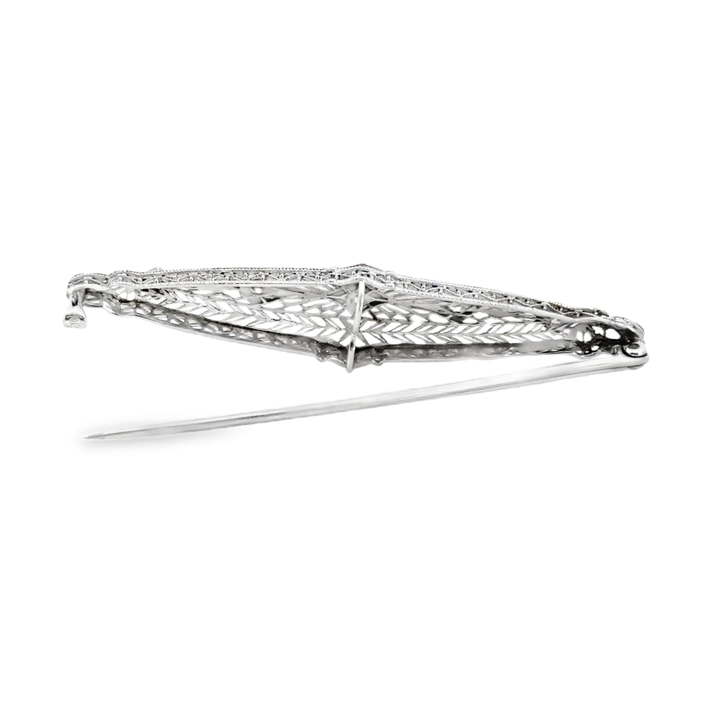 This elegant 14K white gold bar pin features a stunning openwork filigree design, characteristic of early 20th-century craftsmanship. The elongated, slightly tapered shape is adorned with diamond accents, bezel-set in delicate geometric frames, creating a harmonious balance between structure and artistry.