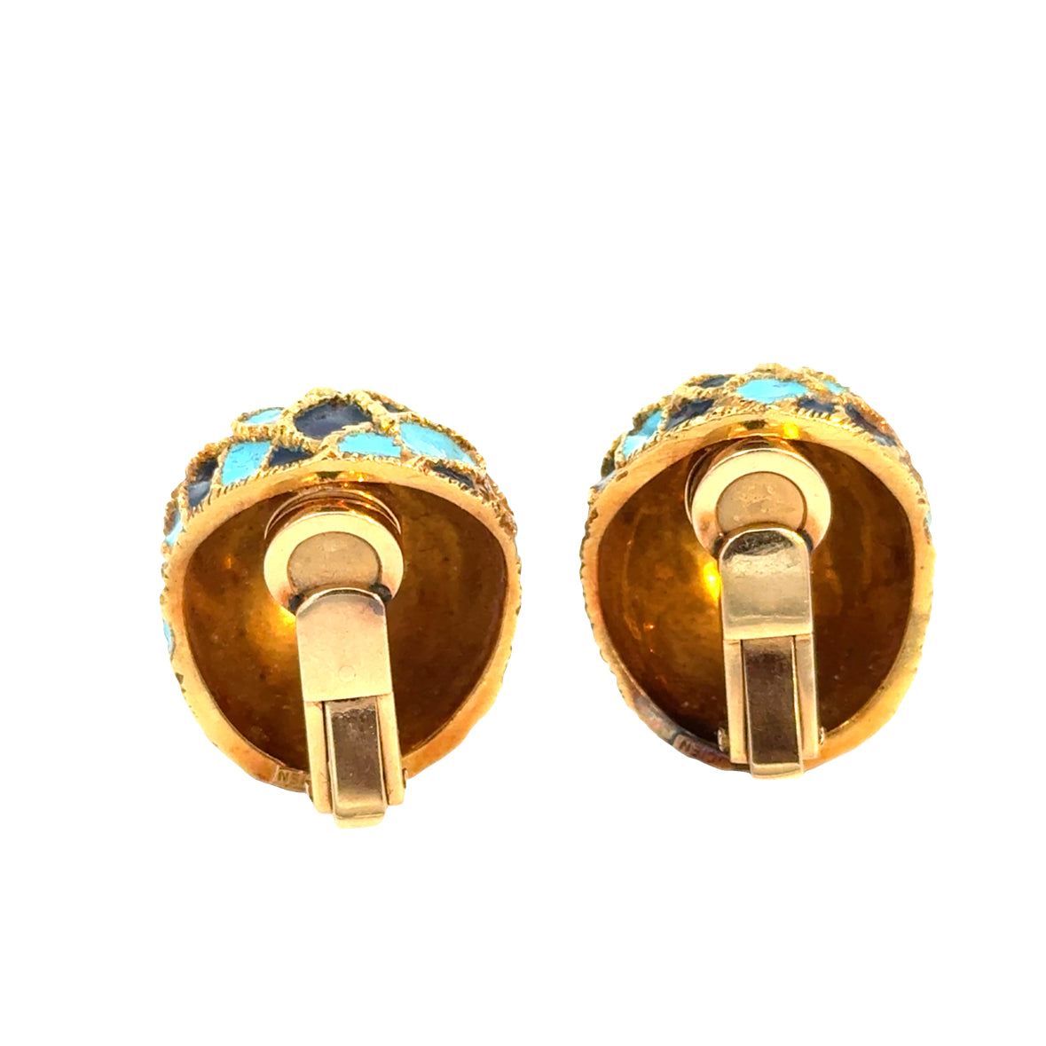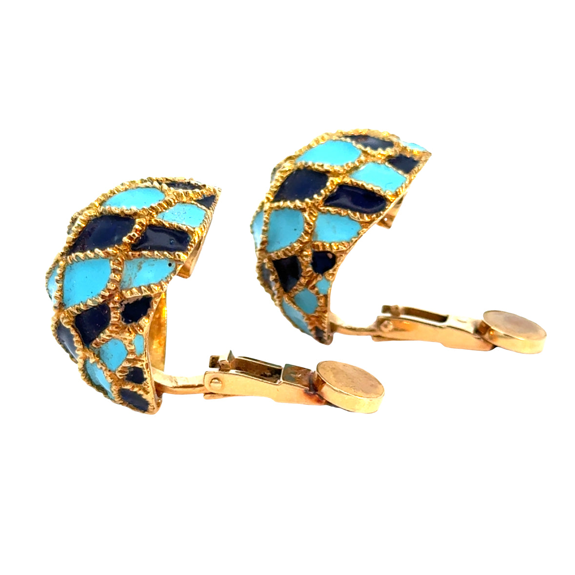 A striking pair of 1950’s domed clip-on earrings crafted in rich 18K yellow gold and decorated with vibrant turquoise and deep navy enamel. The bold, sculptural dome form is enhanced by a textured gold lattice motif, creating beautiful depth and dimension across the surface.
