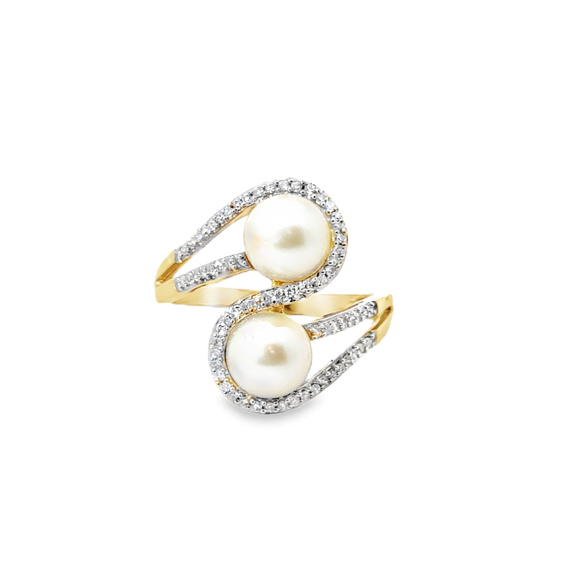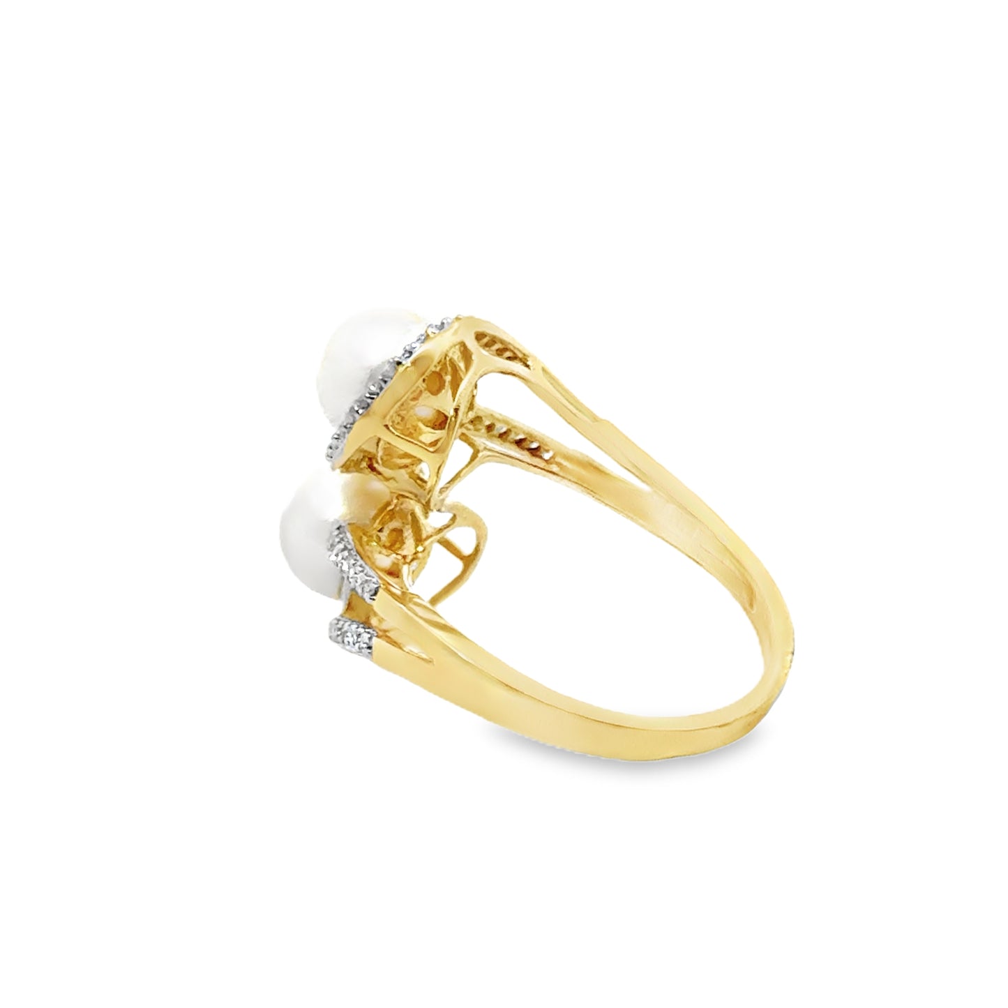 This exquisite 14K yellow gold bypass ring is a stunning blend of elegance and sophistication, featuring two lustrous cultured pearls gracefully set within a delicate swirl of shimmering diamonds. The bypass design creates a sense of movement and fluidity, enhancing the timeless appeal of this vintage-inspired piece. The pearls exude a soft, radiant glow, while the sparkling diamonds add brilliance and contrast, catching the light from every angle. Crafted with meticulous attention to detail, this ring is perfect for those who appreciate classic beauty with a touch of modern refinement. Whether worn as a statement piece or a symbol of enduring love, this pearl and diamond ring is a timeless treasure that adds grace and charm to any jewelry collection.