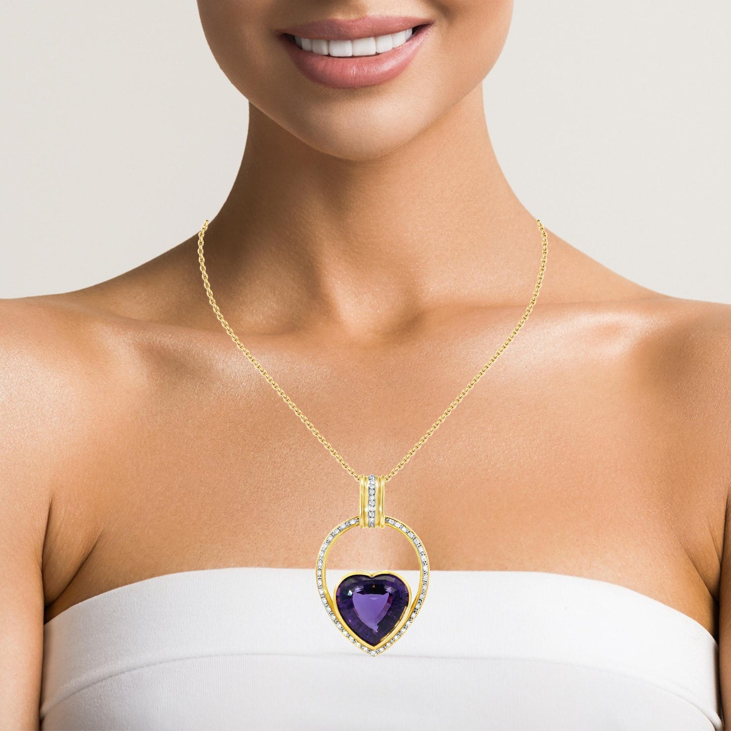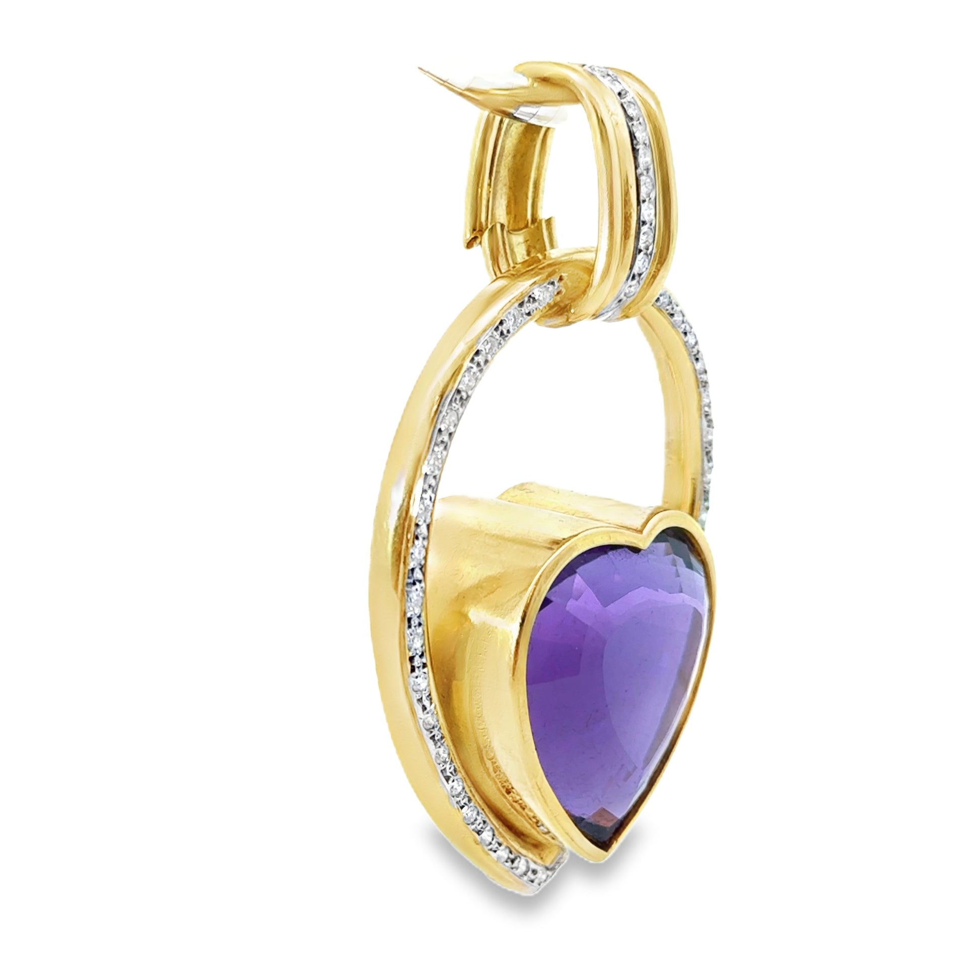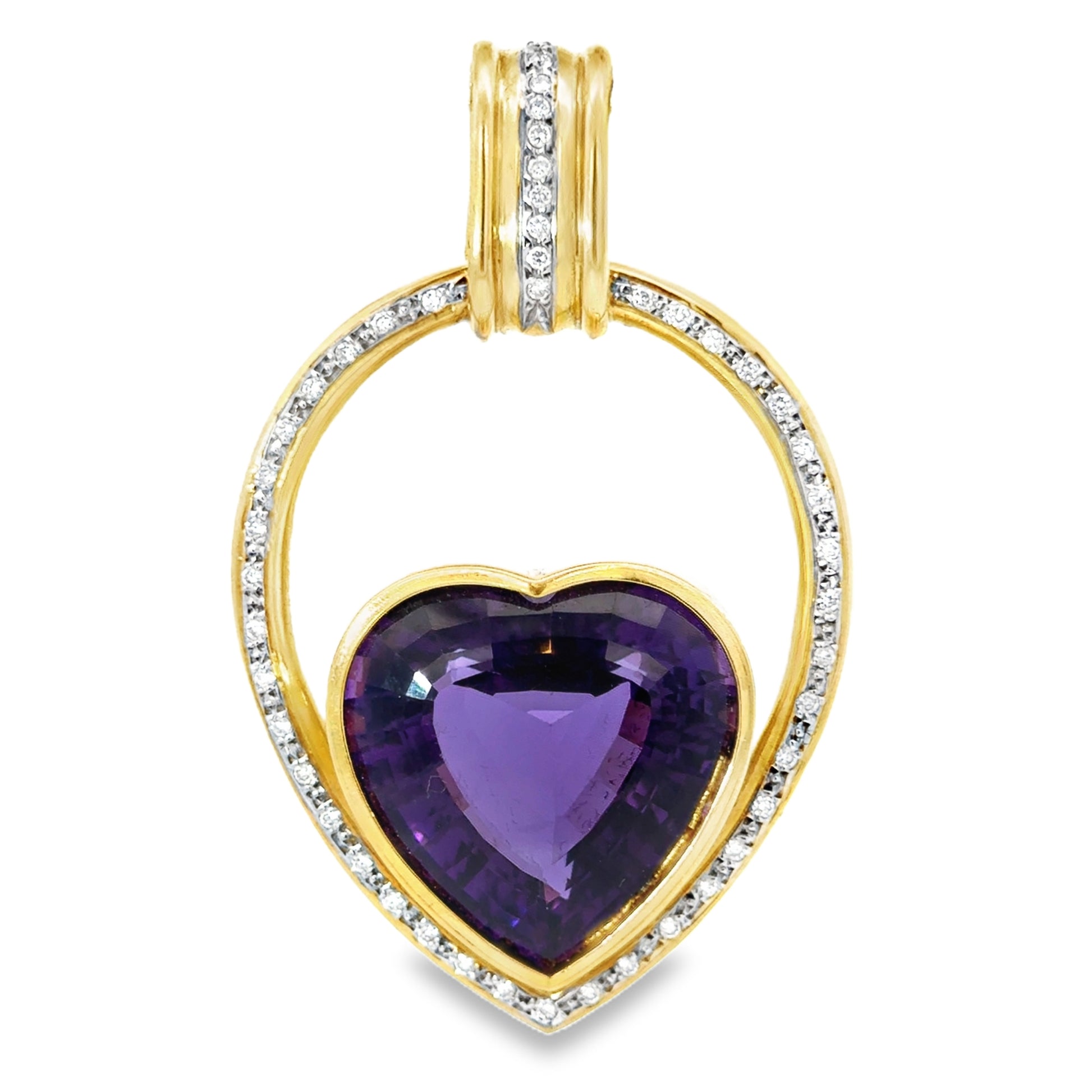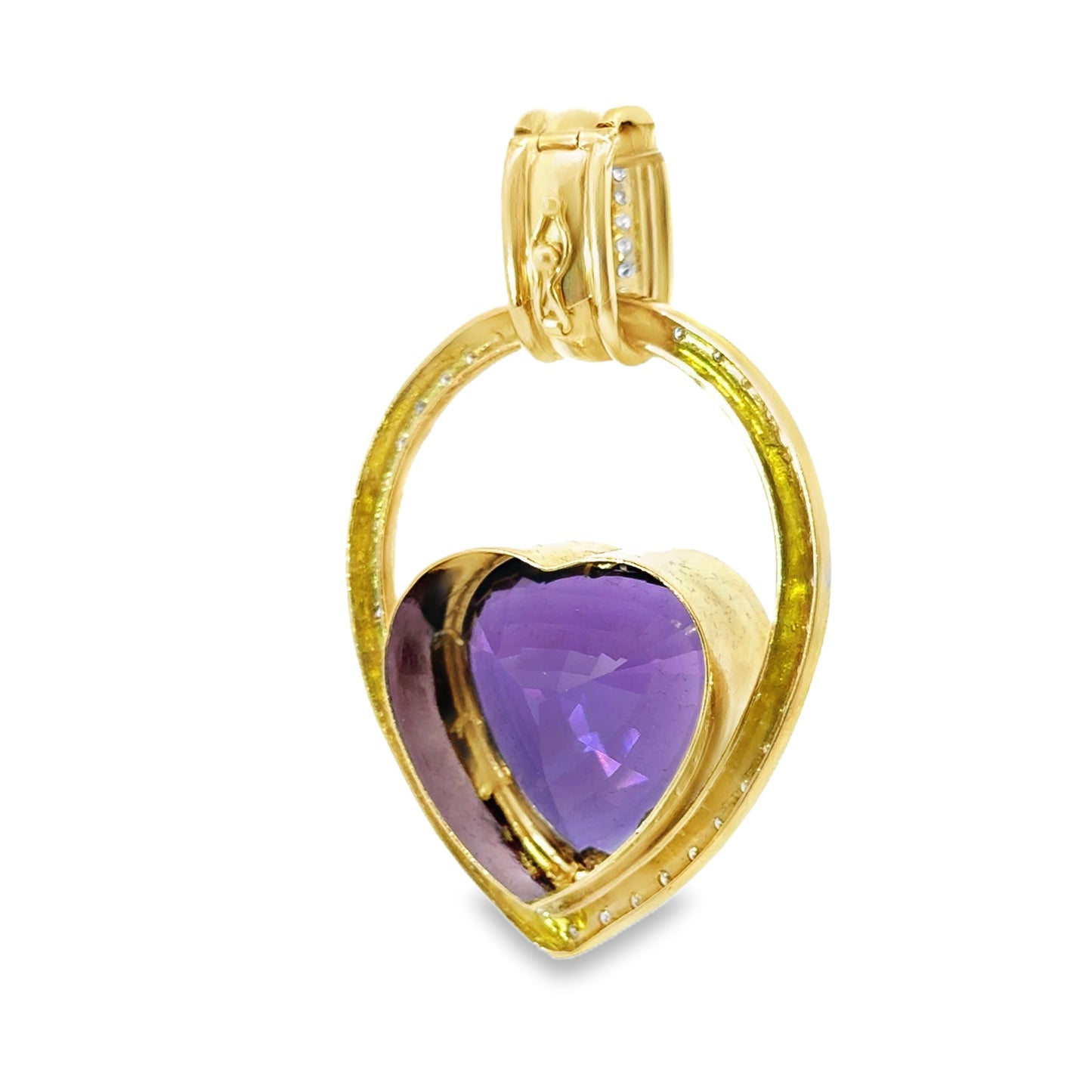 Make a bold and elegant statement with this substantial 18K yellow gold enhancer pendant, featuring a large heart-shaped amethyst as its vibrant centerpiece. Framed within a sweeping open heart design lined with sparkling round diamonds, the pendant is further accented by a diamond-studded enhancer bail. Measuring approximately 2.5 inches long by 1.5 inches wide and weighing 31.8 grams, this piece is both luxurious and eye-catching. Perfect for pairing with a gold chain or strand of pearls, it opens to accommodate larger necklaces with ease.