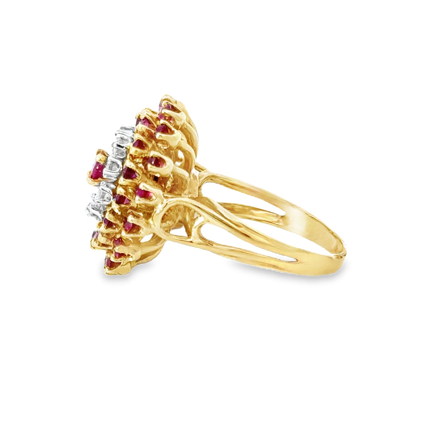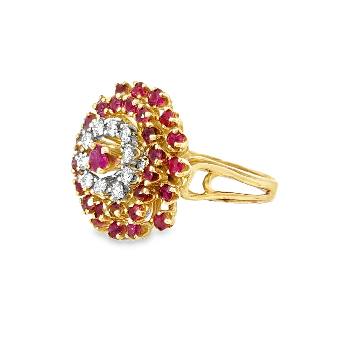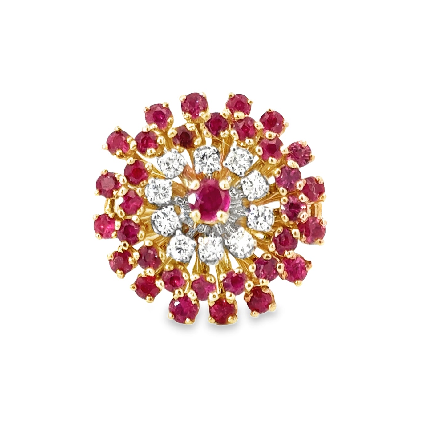 This exquisite 14K yellow gold ring features a mesmerizing display of rubies and diamonds, designed with exceptional craftsmanship that is stunning from every angle. The ring’s design resembles a radiant floral or sunburst motif, with a central cluster of bright diamonds surrounded by layers of vivid red rubies. The rubies are arranged in a circular, layered pattern, with each gemstone set in a delicate prong that allows light to enhance their rich color and sparkle.