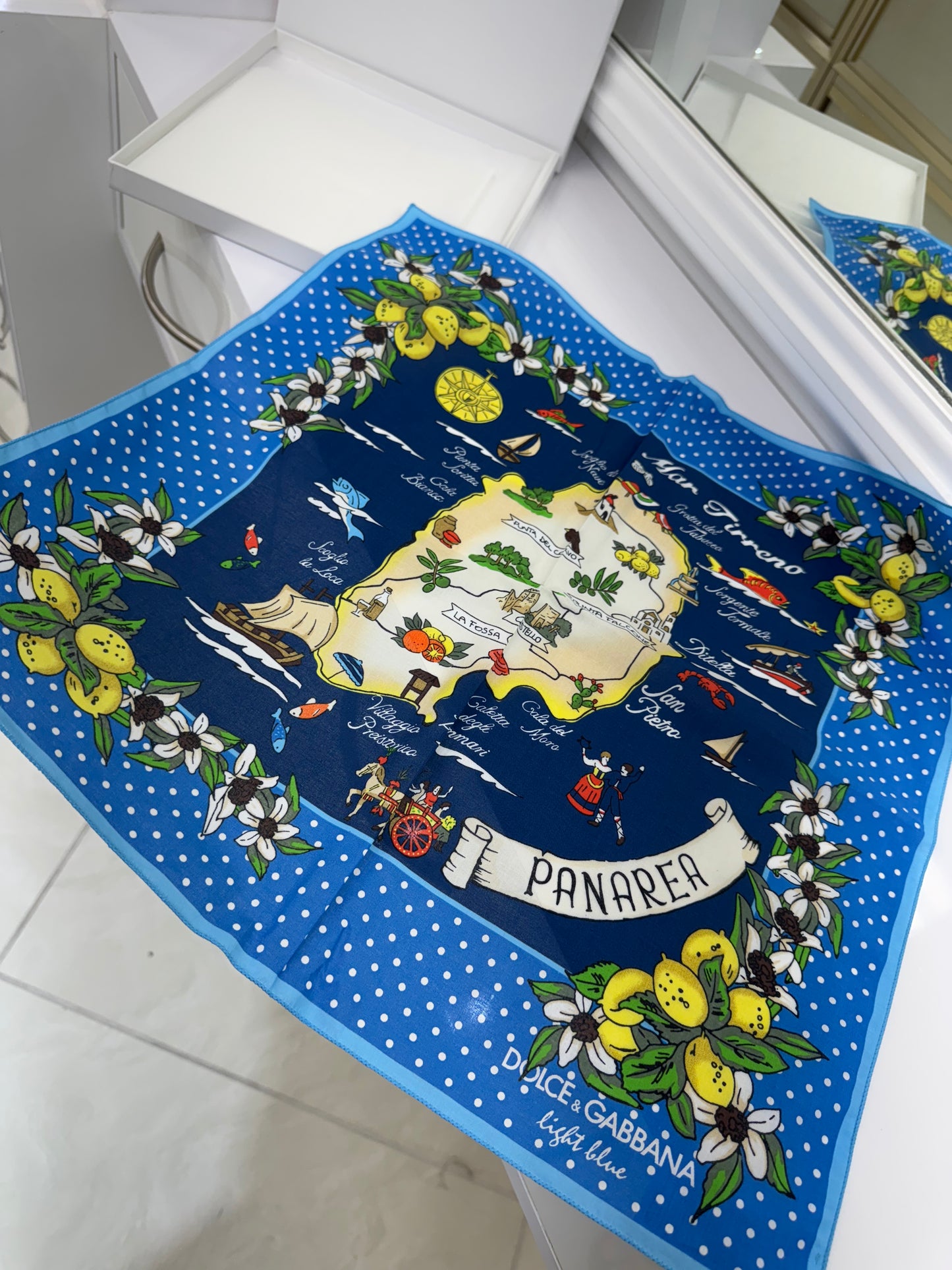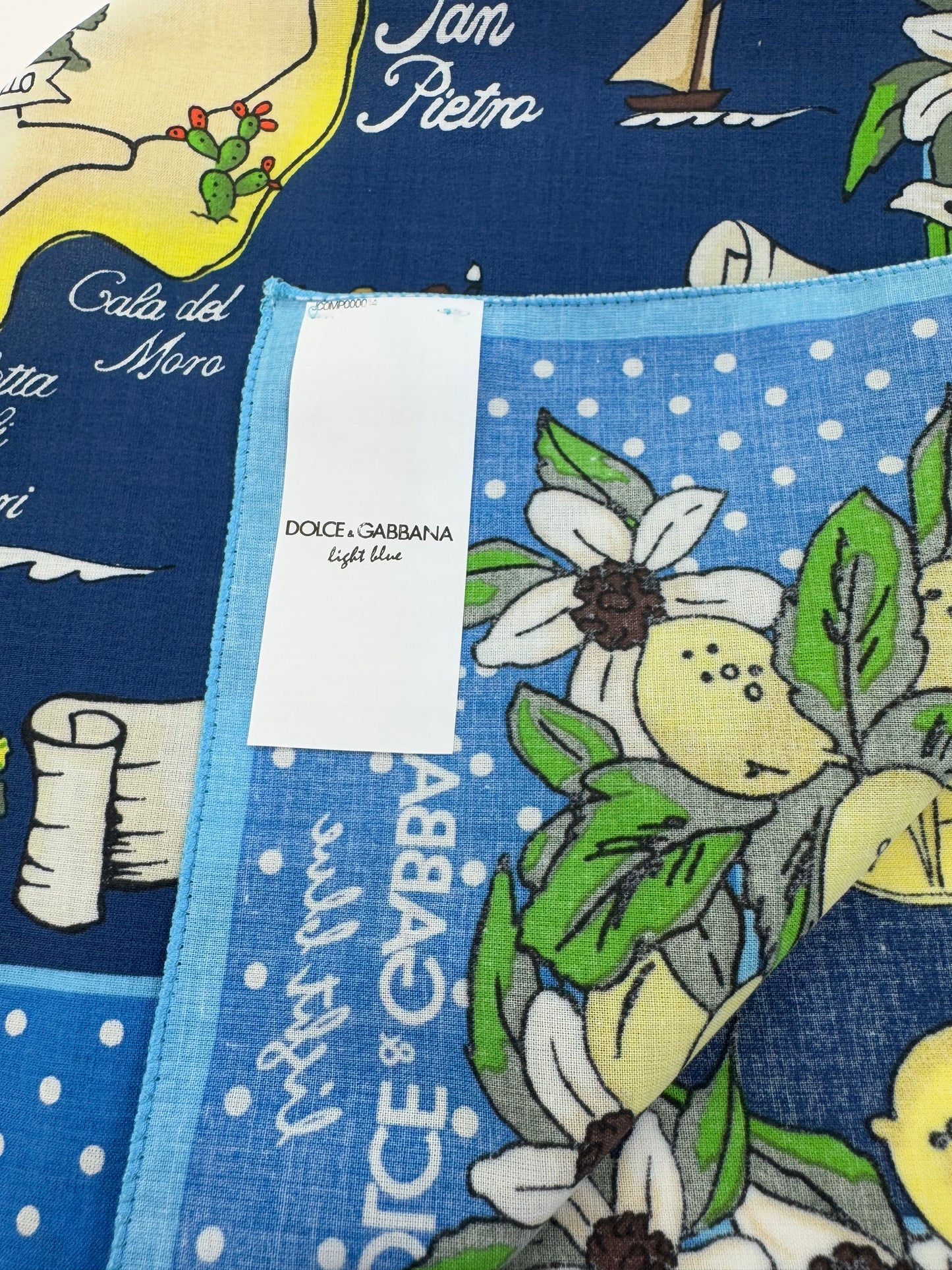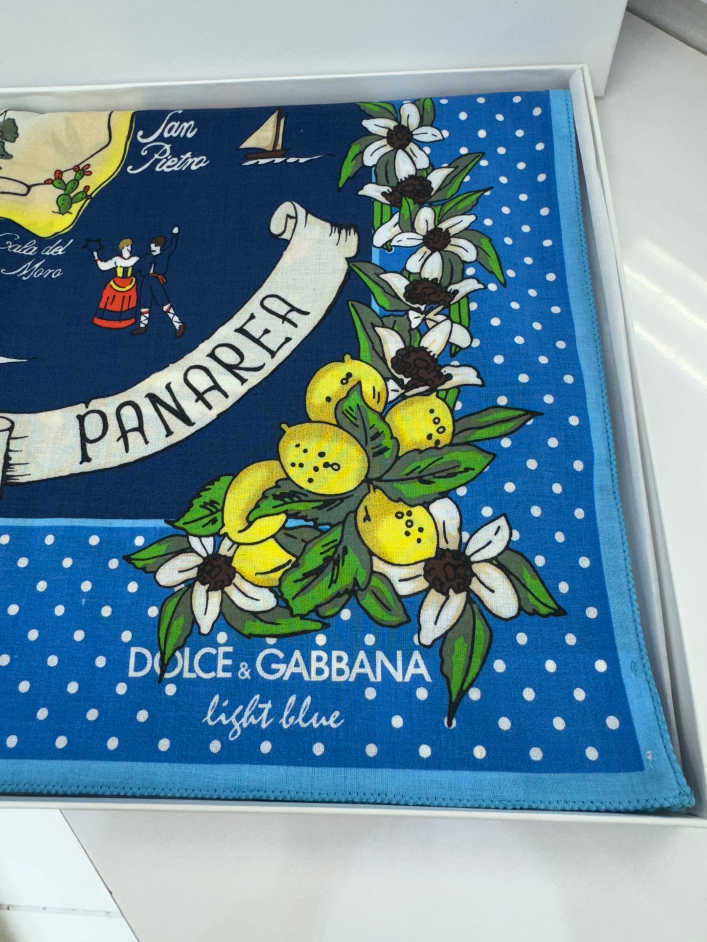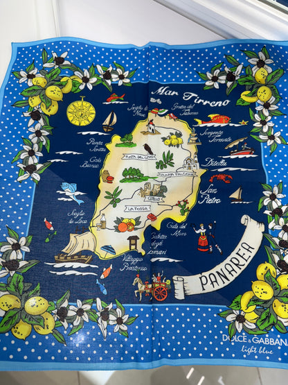Celebrate Mediterranean charm with this delightful Dolce & Gabbana cotton scarf inspired by the island of Panarea. Part of the Light Blue collection, this vibrant 100% cotton accessory features a playful illustrated map of the island surrounded by white flowers, lemons, and dotted borders on a bright blue background. A cheerful, collectible piece perfect for sunny days or gifting.