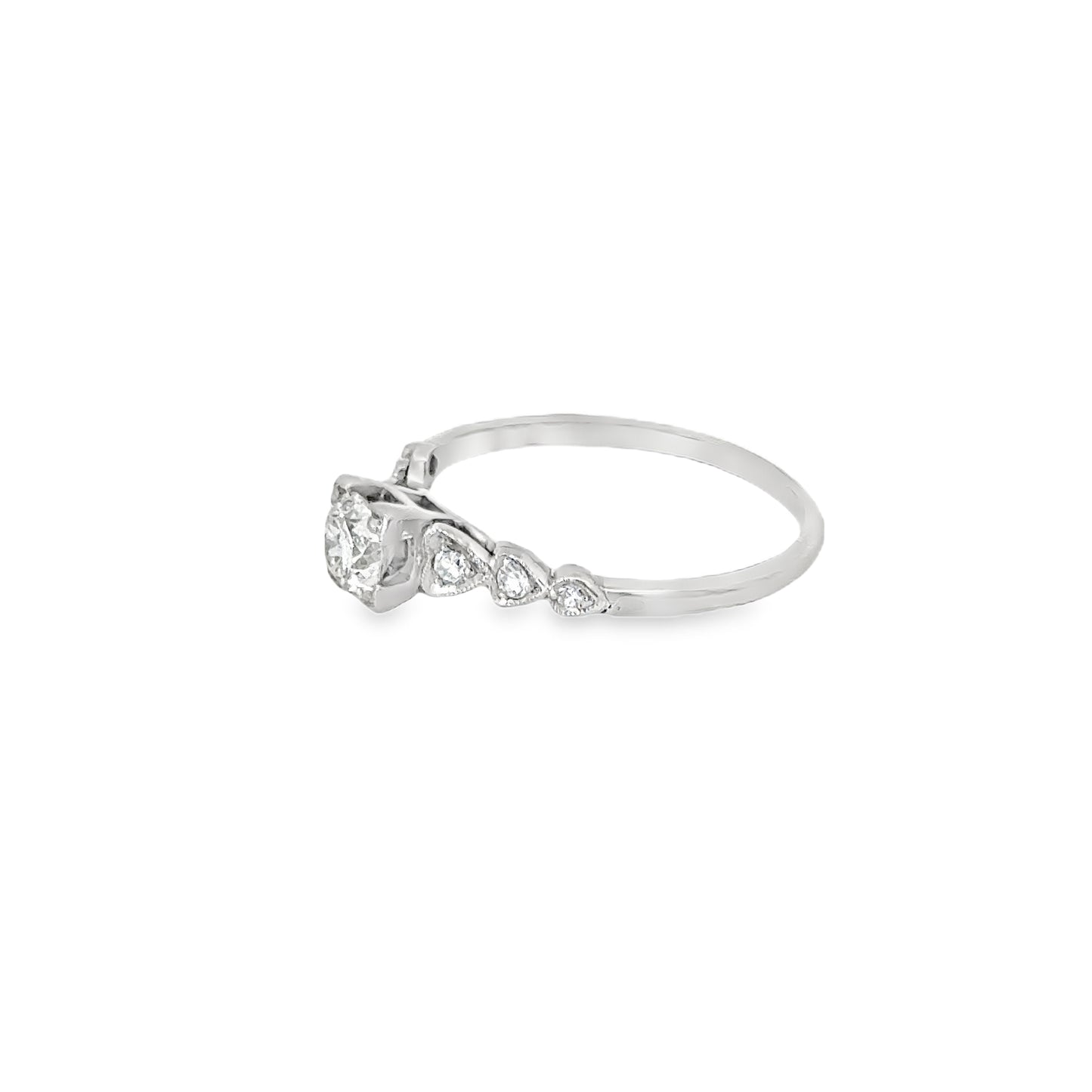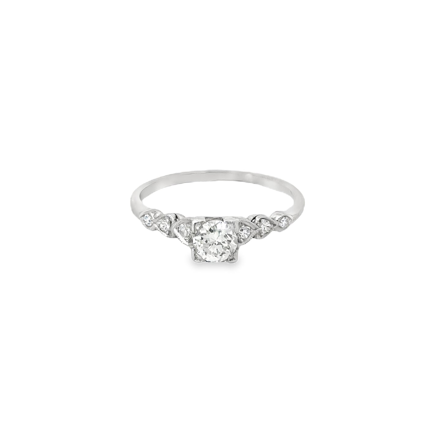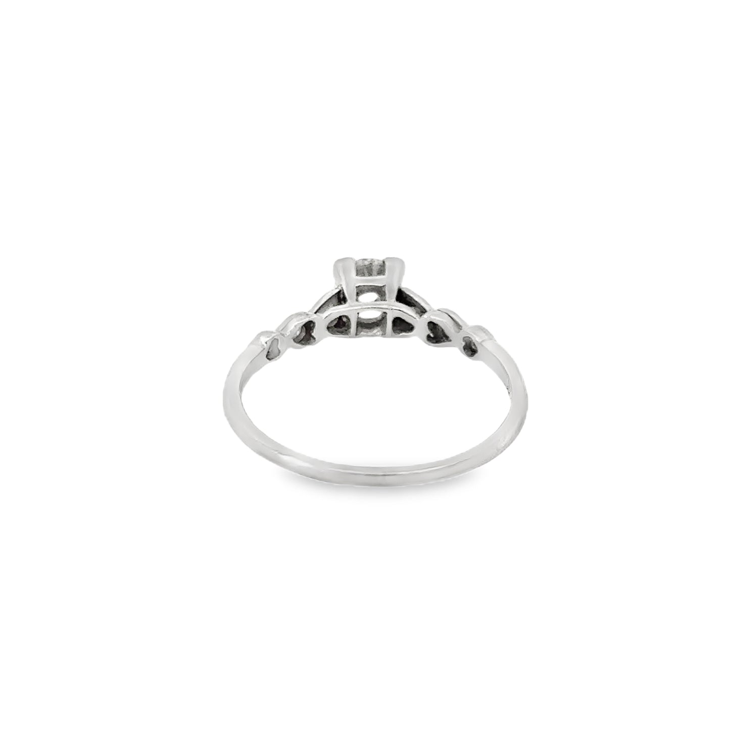 Antique engagement ring crafted from platinum and features a delicate design that incorporates heart-shaped accents along the band. The center stone is a round diamond, securely set in a traditional prong setting, allowing the diamond to take center stage. The surrounding hearts, which are also adorned with small diamonds, add a touch of romance and uniqueness to the ring. The band itself is thin and elegant, making the ring both timeless and sweetly feminine. The combination of the intricate heart details and the sparkling diamonds creates a beautiful piece that is both charming and eye-catching.
