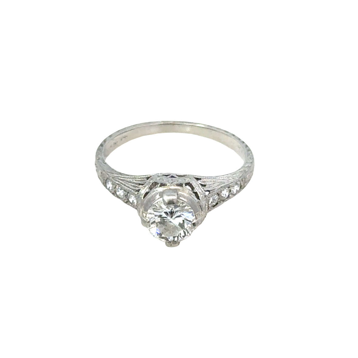 A graceful antique platinum diamond ring exemplifying the elegance and fine detailing of the Art Deco era (circa 1920s–1930s). The ring features a bright round brilliant center diamond, securely set in a softly contoured platinum head that highlights the stone’s brilliance while maintaining a refined, timeless profile.