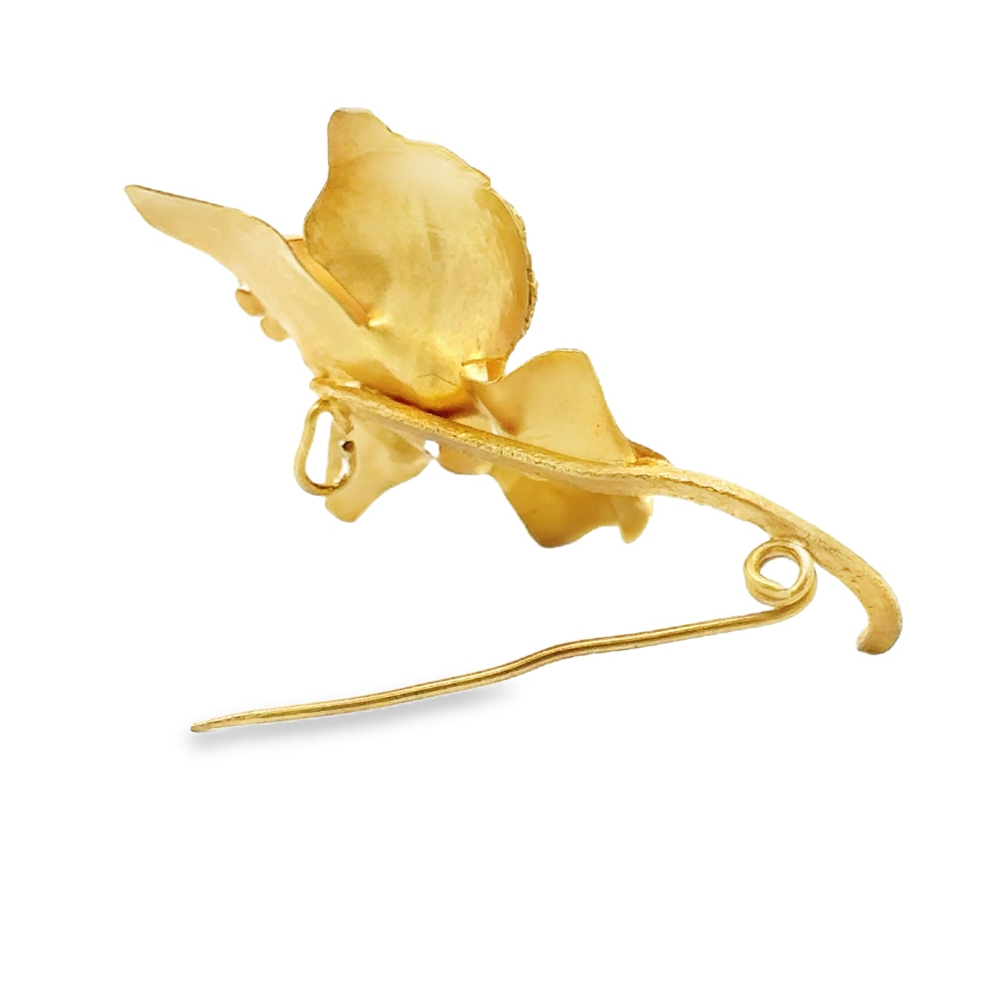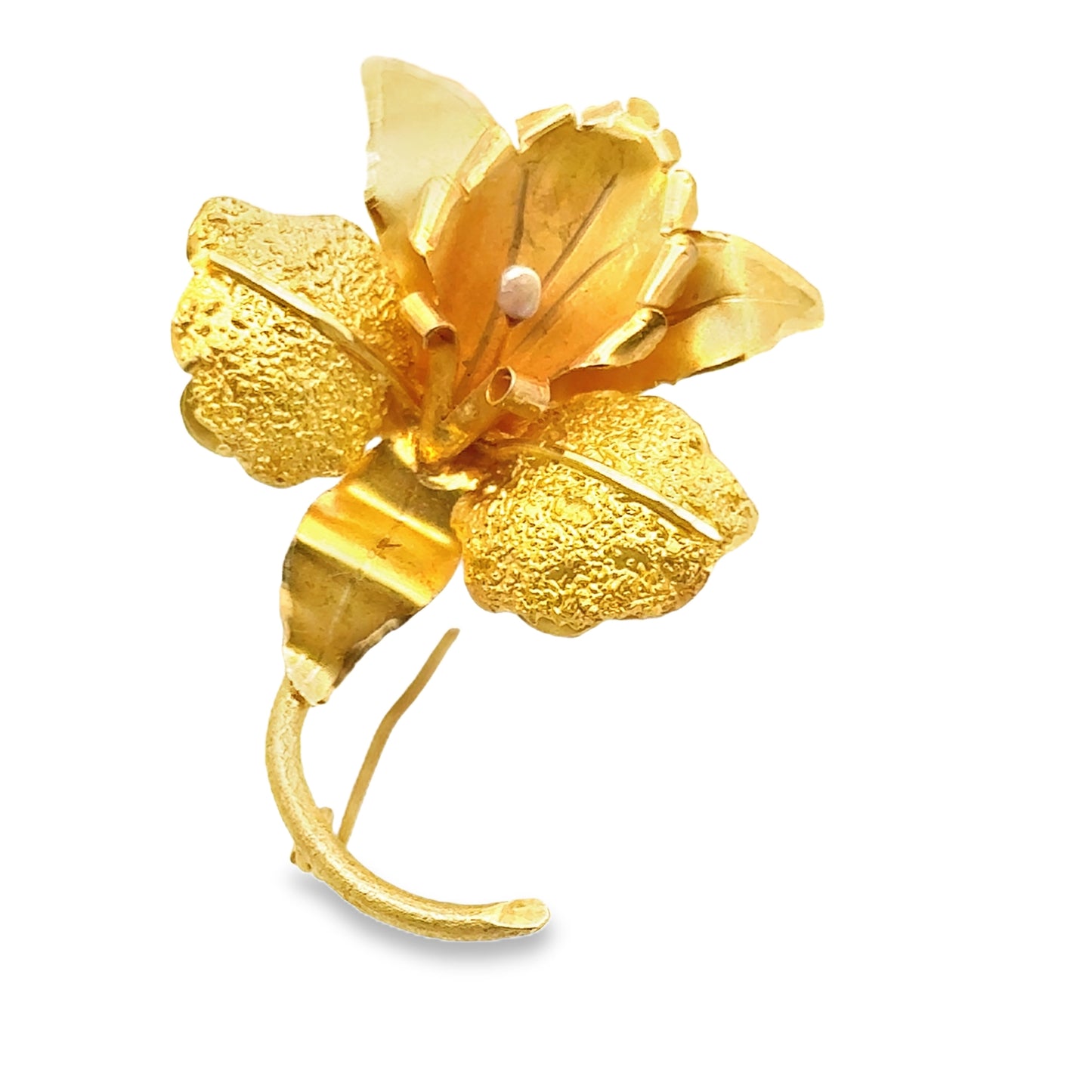 This elegant brooch is crafted from 18k yellow gold and features a striking floral design. The petals are delicately shaped with a combination of smooth and textured finishes, showcasing intricate detailing that mimics the natural beauty of a flower. The textured leaves add depth and contrast to the polished gold, creating a visually appealing composition.