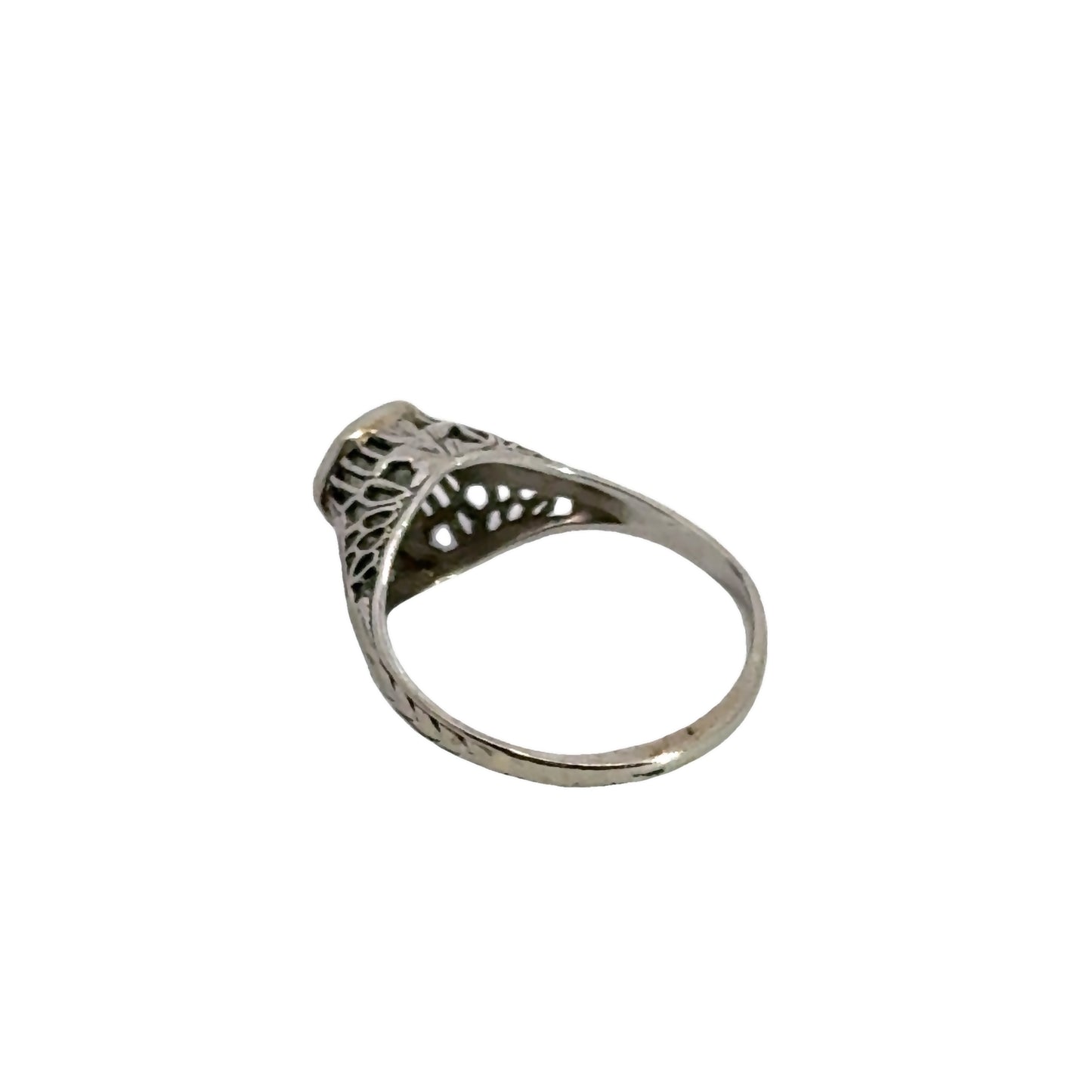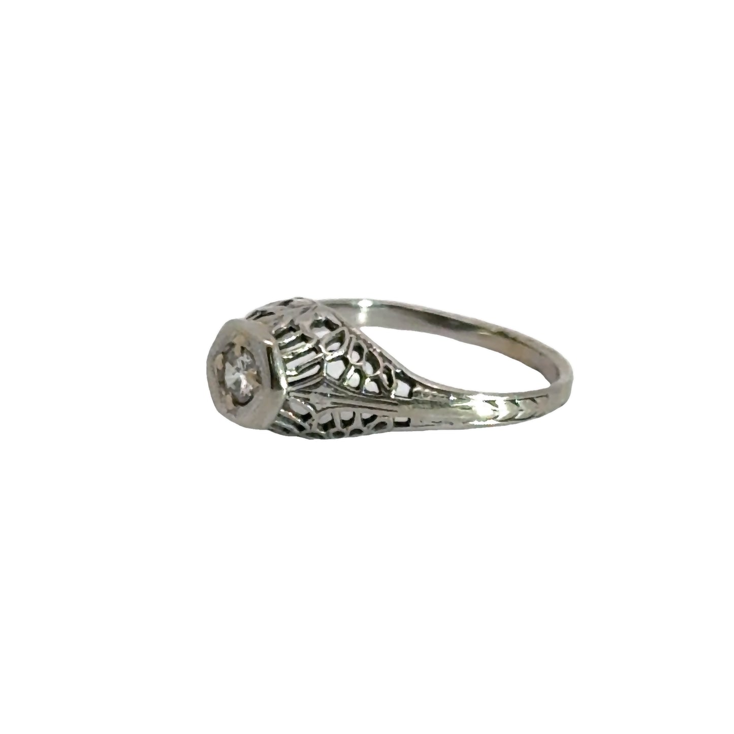 14K White Gold, Round-Cut Diamond Approx.0.20ct., Filigree Setting, Size 4.5, Antique, 1920 *Resizing available |