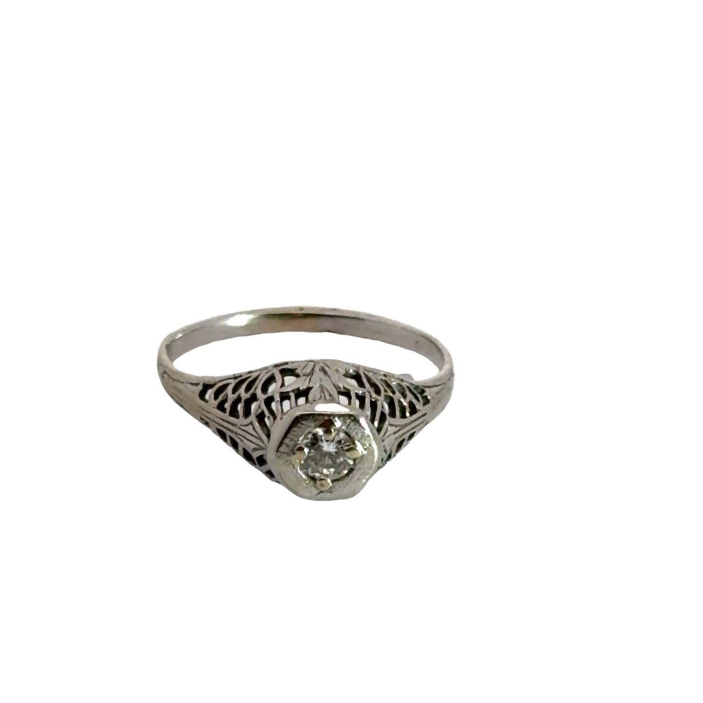 Antique engagement piece from the 1920s, crafted in 14K white gold. It features a delicate filigree design, which is characteristic of the Art Deco period, highlighting intricate metalwork. The centerpiece of the ring is a single diamond, set within a hexagonal bezel setting that adds to the vintage charm of the piece. The diamond is accentuated by the openwork pattern on the band, which allows light to pass through, enhancing its brilliance. This ring is a beautiful representation of early 20th-century jewelry craftsmanship, combining elegance with intricate detailing.