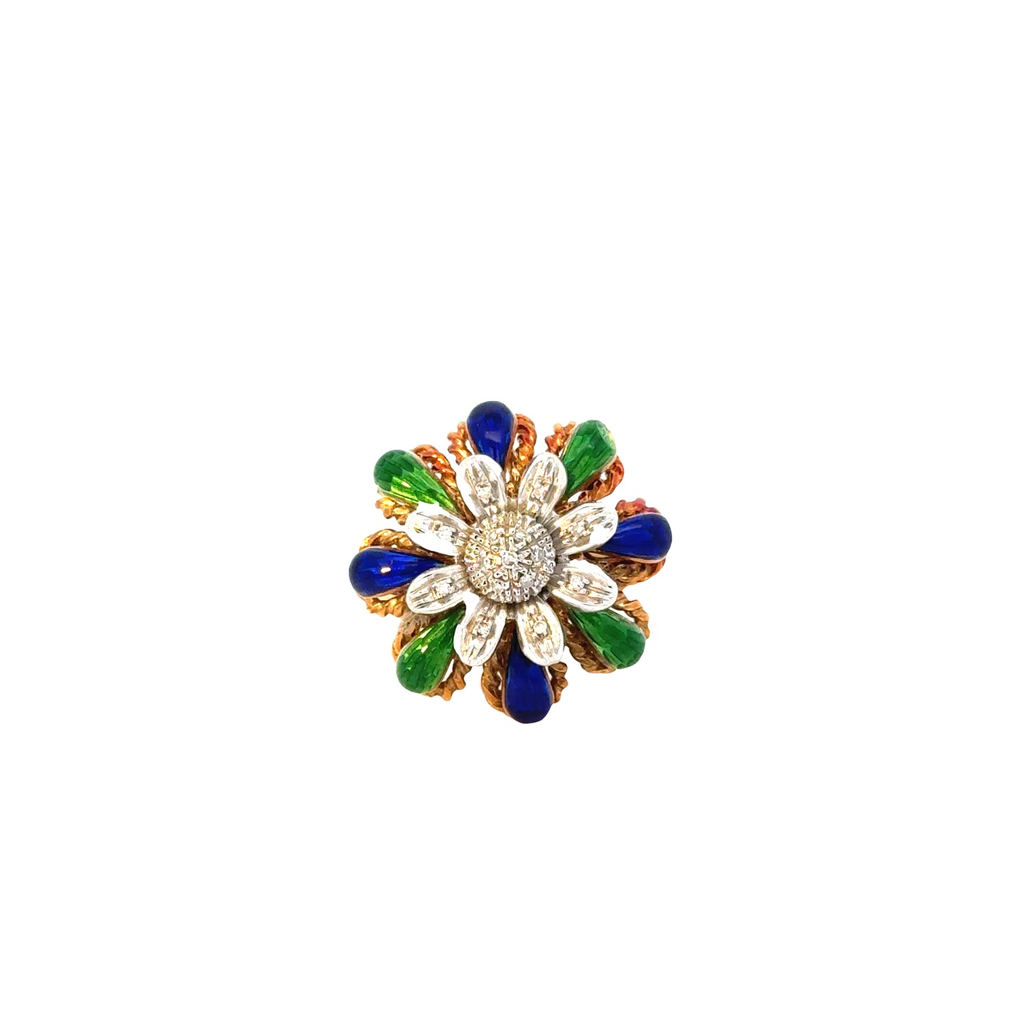 18K, Yellow Gold, Green & Blue Enamel, 0.25 ct. Diamonds, Size 7.25, 1950's |