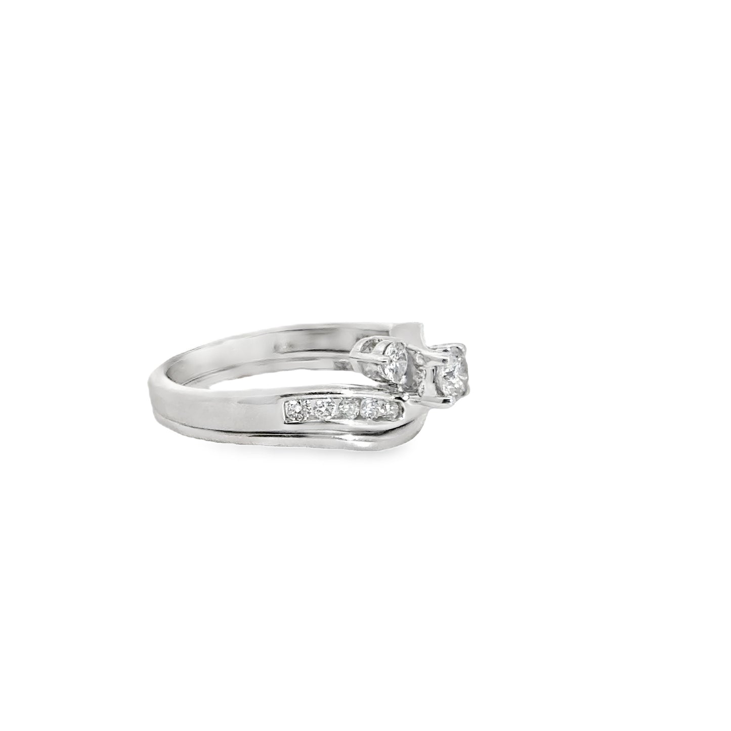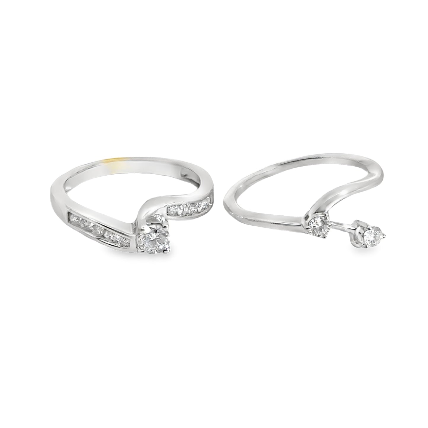 This engagement ring and wedding band set is a stunning antique design crafted in 10k white gold. The engagement ring features a unique, flowing band that gracefully embraces a central diamond, with additional diamonds set along the curved band, adding a touch of elegance and sparkle. The wedding band complements the engagement ring perfectly, echoing the same flowing design and seamlessly fitting together to create a cohesive and beautiful set. This vintage-inspired set is a timeless expression of love and commitment, perfect for those who appreciate the charm and elegance of antique jewelry.