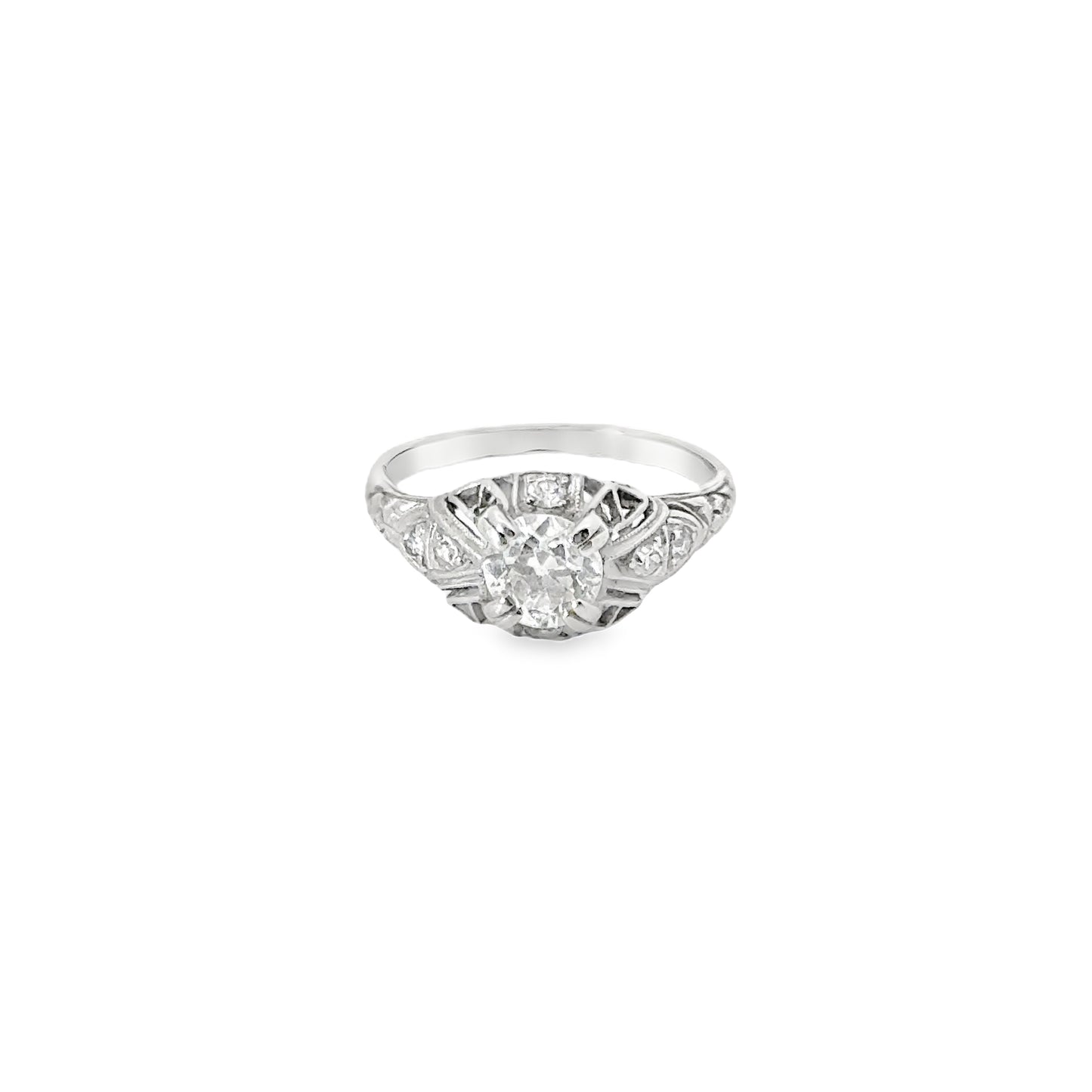 Antique engagement ring crafted from platinum, showcasing a stunning domed design. The ring features intricate detailing, including delicate milgrain work along the band, which adds to its vintage charm. At its center, a round diamond is securely set, flanked by additional smaller diamonds that enhance its brilliance. The elegant and intricate design makes this ring a timeless piece that looks absolutely beautiful on the hand. Ideal for those who appreciate vintage jewelry with a touch of classic sophistication.