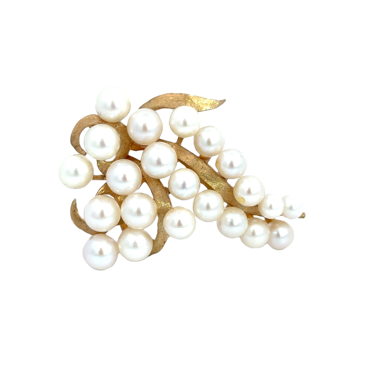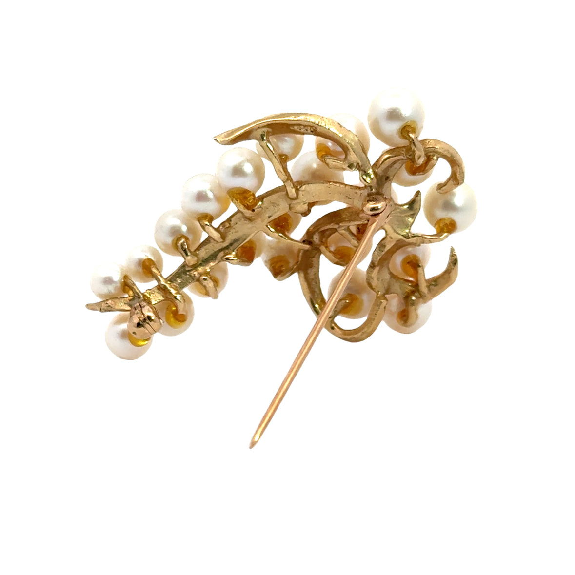 This 14k yellow gold pearl brooch is a graceful and elegant representation of timeless design. The brooch features a cluster of creamy white pearls in various sizes, artfully arranged to mimic the natural flow of a cascading floral or grapevine motif. The matte gold branches and leaves provide a soft, organic contrast to the pearls’ smooth and lustrous surfaces, enhancing their radiance. Each pearl is carefully set, contributing to the brooch’s harmonious and balanced appearance. This vintage-inspired piece reflects exquisite craftsmanship, making it a versatile accessory for both formal attire and everyday sophistication.