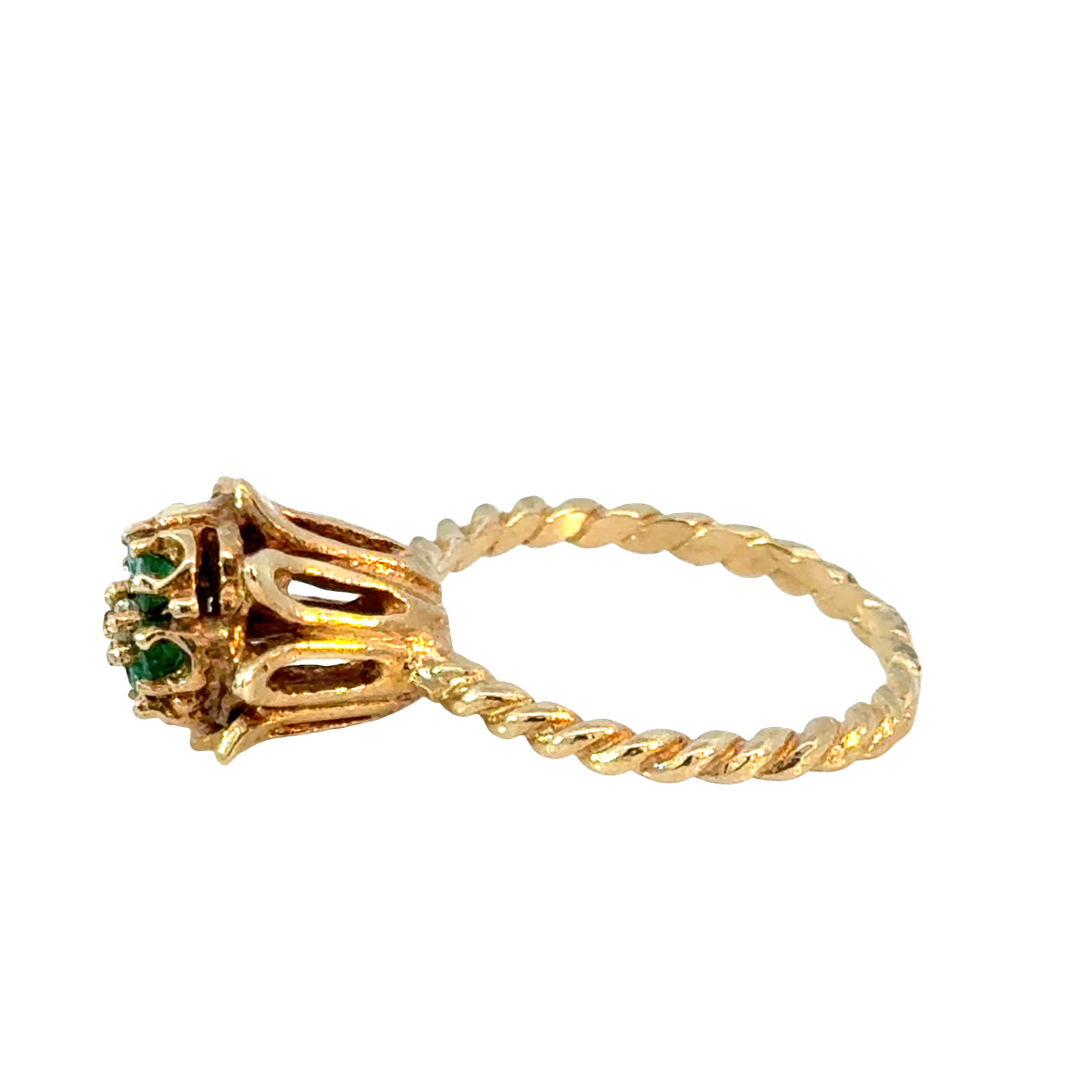 A beautifully detailed 14K yellow gold ring featuring a vibrant emerald cluster surrounding a single brilliant diamond at the center. The gems are arranged in a delicate flower motif, rising from an ornate, openwork crown-like gallery. The twisted rope band adds a charming, hand-wrought touch that enhances the ring’s vintage appeal. Measuring approximately 10mm across the front with a 12mm domed profile and 2mm band width, this ring balances elegance with sculptural artistry.