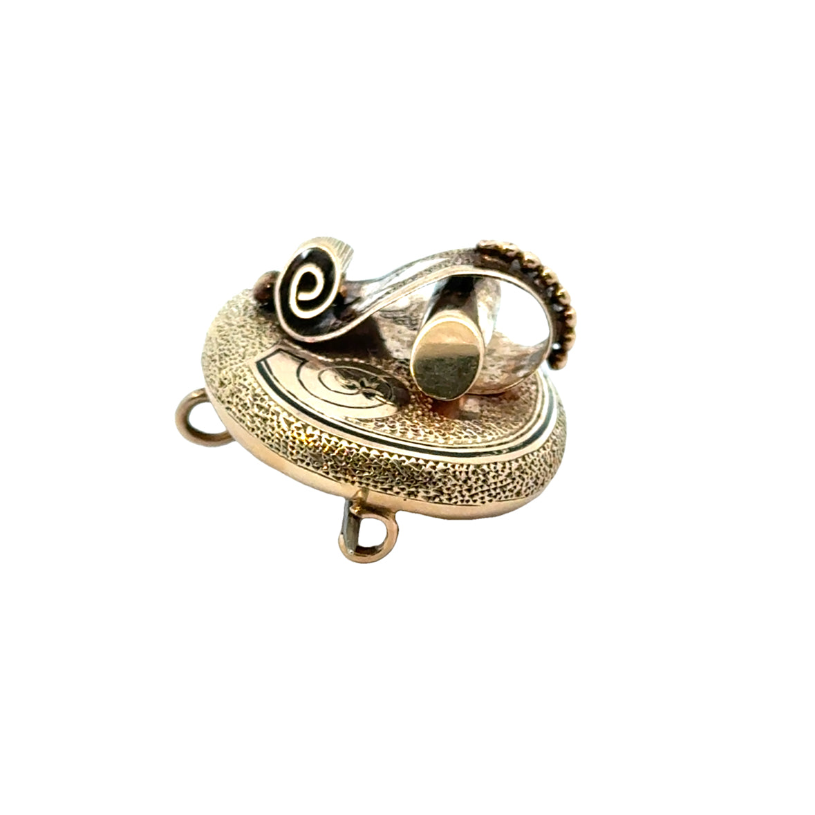 The central motif includes a raised, scroll-like element flanked by polished gold bars and beadwork detailing, showcasing exceptional artistry. The versatility of this piece is evident with its dual function as a brooch or pendant, supported by small loops for attaching a chain. This elegant item encapsulates the opulence and fine craftsmanship of 19th-century jewelry, making it a timeless treasure for collectors and enthusiasts.