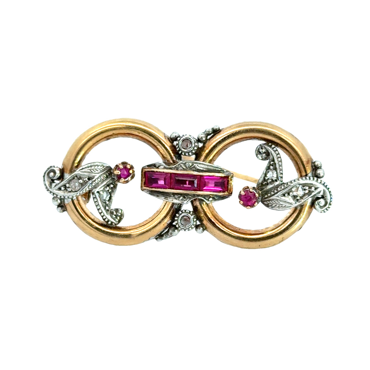 This lovely 18k yellow gold brooch showcases an elegant symmetrical design featuring rubies and intricate detailing. The brooch consists of two interlocking gold circles, symbolizing unity and harmony, accented by ornate white gold leaf motifs with delicate beadwork. At the center, three rectangular baguette-cut rubies are bezel-set, adding a rich pop of vibrant red, flanked by two round ruby accents for a balanced and luxurious look. The combination of yellow gold and white gold enhances the contrast, drawing attention to the intricate craftsmanship and gemstone settings. This piece is a timeless accessory, ideal for those seeking a classic yet sophisticated vintage brooch.